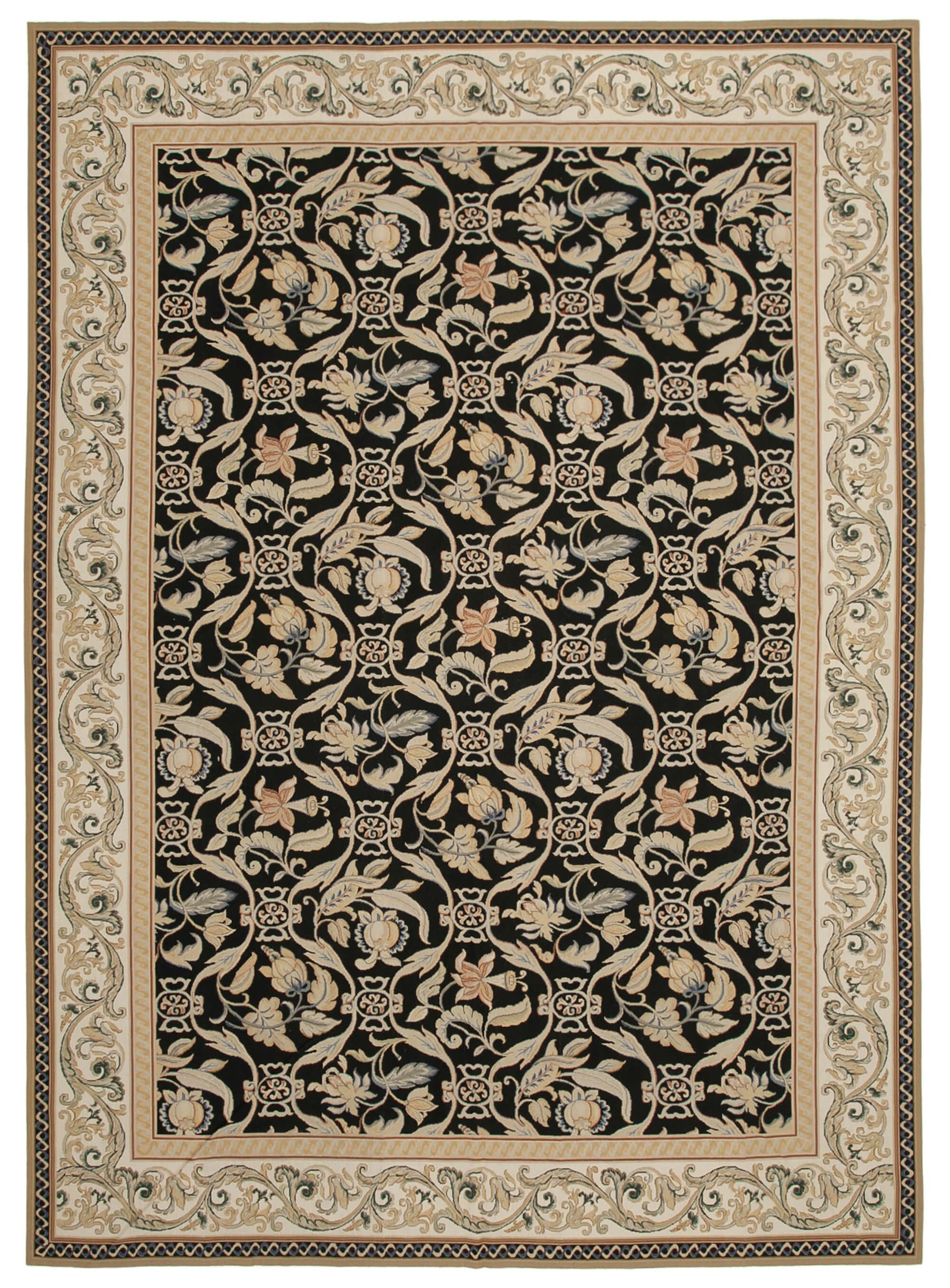 The intricate design of this rug features a harmonious blend of beige and black tones, creating a sophisticated and versatile palette. The central pattern is a stunning display of floral motifs, intricately woven to capture the essence of nature's beauty. The border showcases a delicate scrollwork design, adding a touch of elegance and framing the central artwork beautifully. This rug's classic design is perfect for both contemporary and traditional interiors, offering a seamless blend of style and functionality.