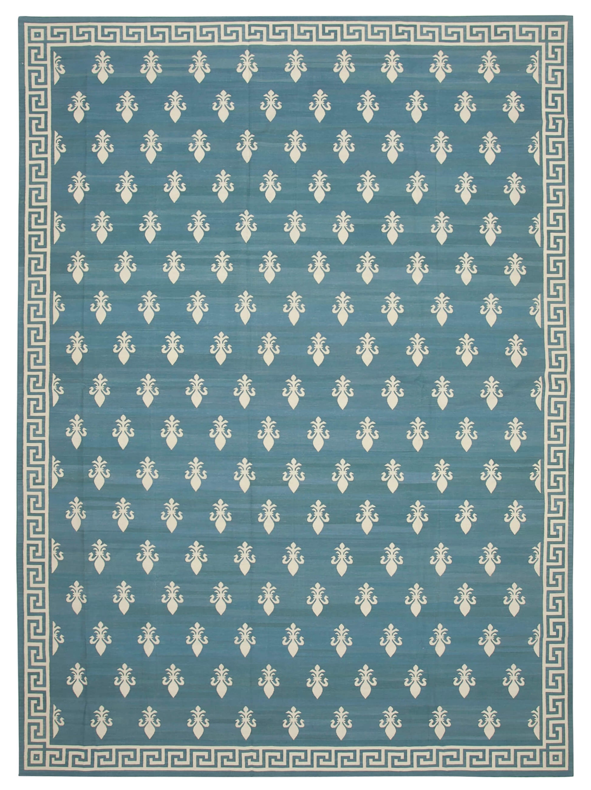 The design of this handwoven rug is a testament to meticulous artistry. The intricate pattern features elegant motifs that are both classic and contemporary, making it a versatile addition to any decor style. The border showcases a geometric design that frames the central pattern beautifully, adding depth and dimension. The use of high-quality cotton and wool in the weft and warp ensures a soft yet resilient texture, perfect for high-traffic areas. The harmonious blend of blue hues creates a calming ambiance, making it an ideal centerpiece for your living room, bedroom, or study.