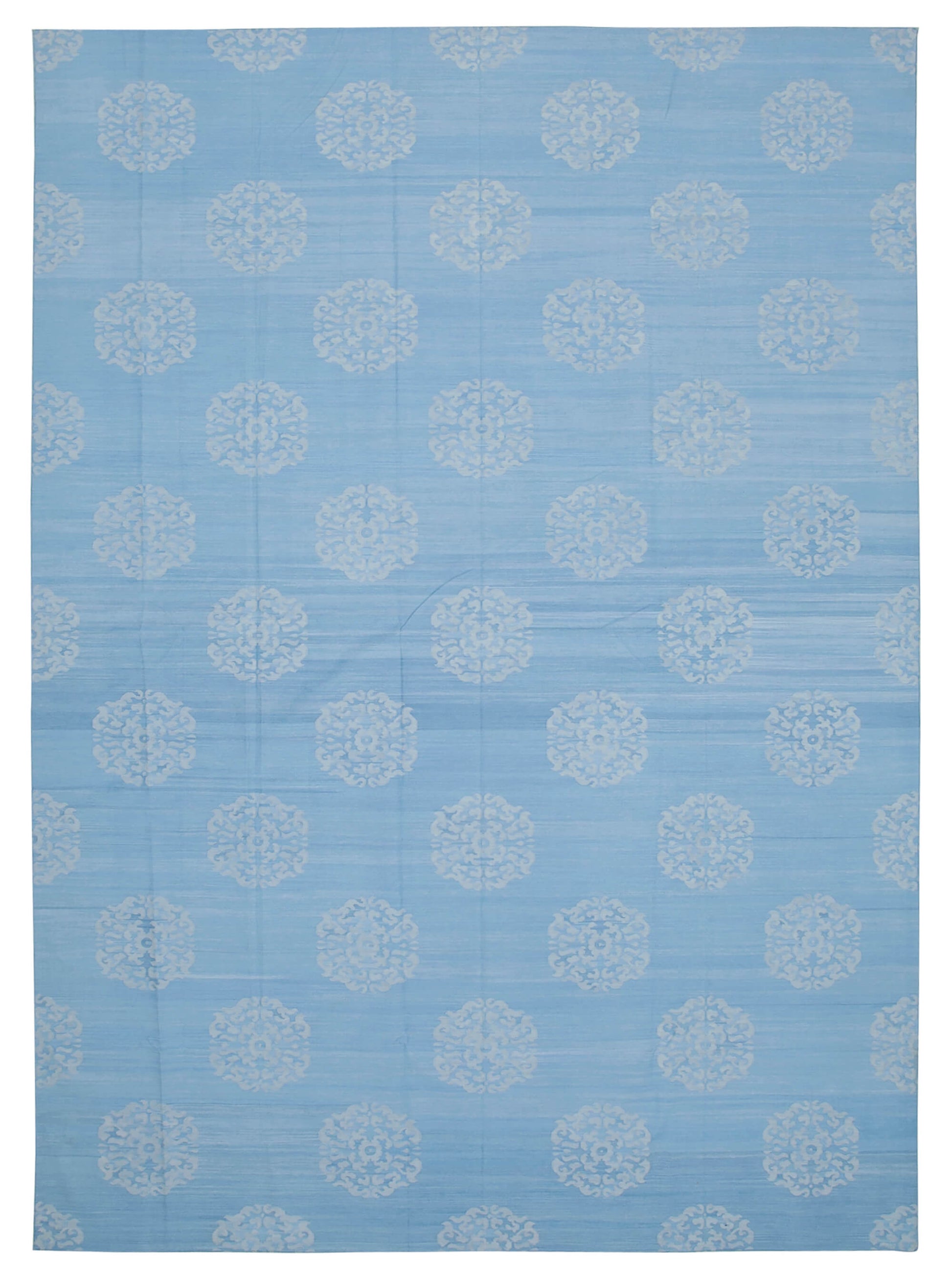 The rug features a captivating design with a soothing blue background adorned with intricate white medallion patterns. This harmonious color palette brings a sense of tranquility and sophistication to your home. The weft and warp of cotton and wool create a soft yet resilient texture, ensuring the rug's longevity. The subtle variations in the blue tones add depth and character, making it a versatile piece that complements both contemporary and traditional interiors. Its large size makes it ideal for spacious living rooms, dining areas, or bedrooms, providing a cozy and inviting atmosphere.