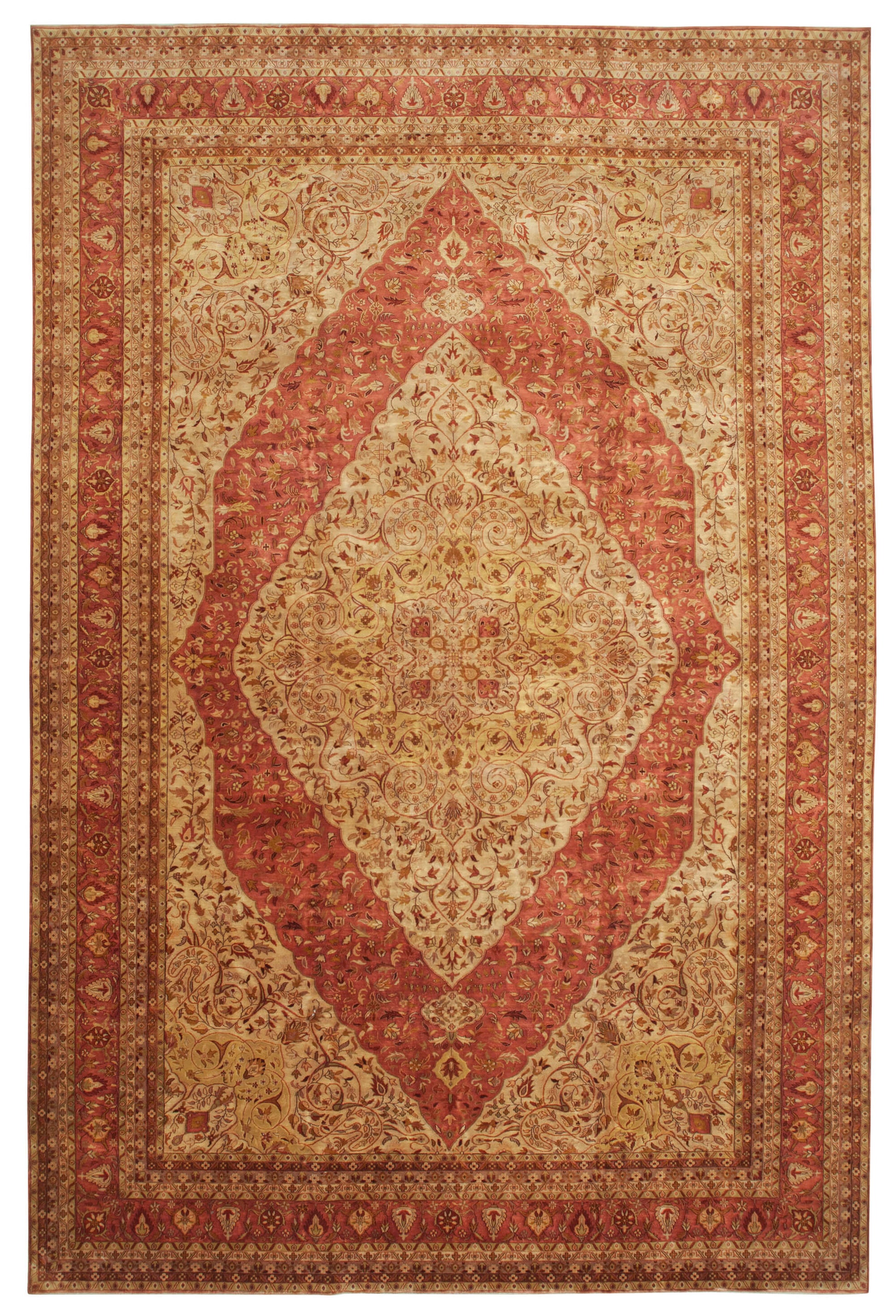 The intricate design of this rug is a testament to the skill and artistry of its creators. Featuring a harmonious blend of red and yellow hues, the rug's pattern is both vibrant and sophisticated. The central medallion is surrounded by an elaborate floral motif, creating a sense of movement and life. The border, adorned with geometric and floral elements, frames the design beautifully, adding a touch of refinement. The use of cotton and wool in the weft and warp provides a soft texture, while the color palette ensures it complements a variety of interior styles.