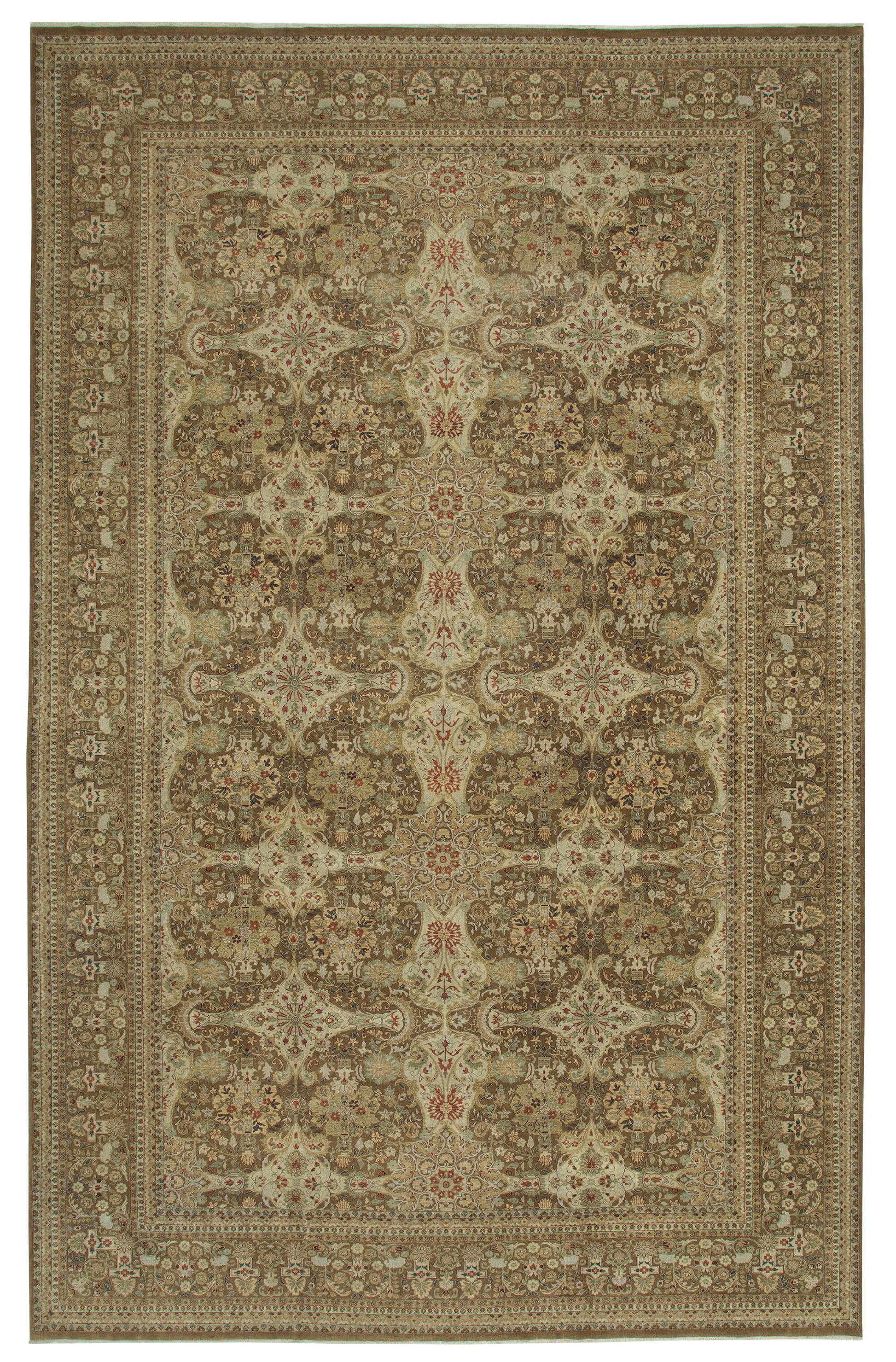 The intricate design of this rug is a harmonious blend of classic and contemporary elements. Dominated by rich brown tones, the pattern features an elaborate array of floral and geometric motifs that create a sense of depth and movement. The border is adorned with a series of smaller, complementary designs that frame the central pattern beautifully. This rug's color palette and design make it a versatile piece that can seamlessly integrate into various interior styles, from traditional to modern. The use of cotton and wool in the weft and warp ensures a soft yet sturdy construction, making it a perfect addition to high-traffic areas.
