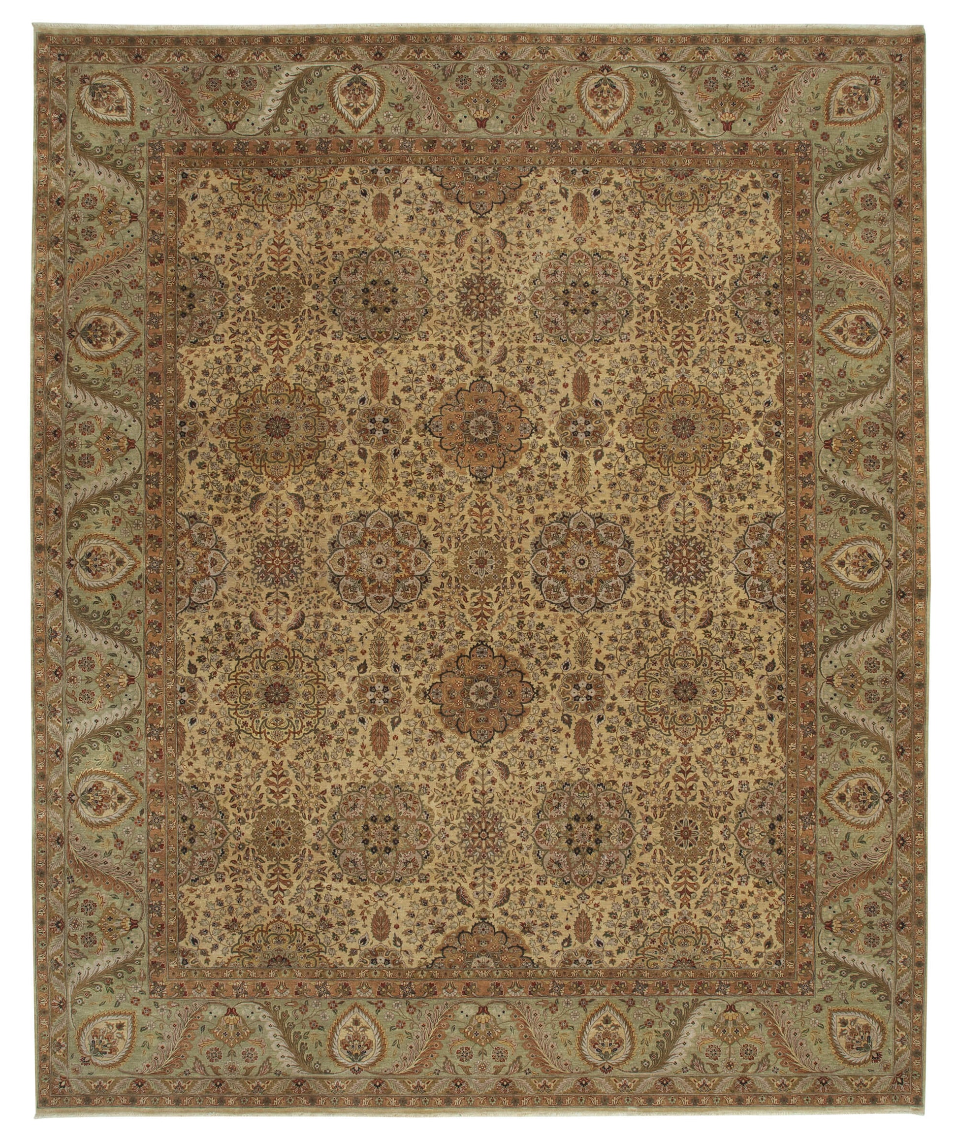 The intricate design of this rug features a harmonious blend of beige and green tones, creating a soothing and sophisticated palette. The central medallion pattern is surrounded by an elaborate border, showcasing the skill and artistry of its weavers. The use of cotton and wool in the weft and warp provides a soft yet resilient texture, making it ideal for high-traffic areas. The subtle variations in color and pattern reflect the unique, handcrafted nature of this piece, ensuring that no two rugs are exactly alike.