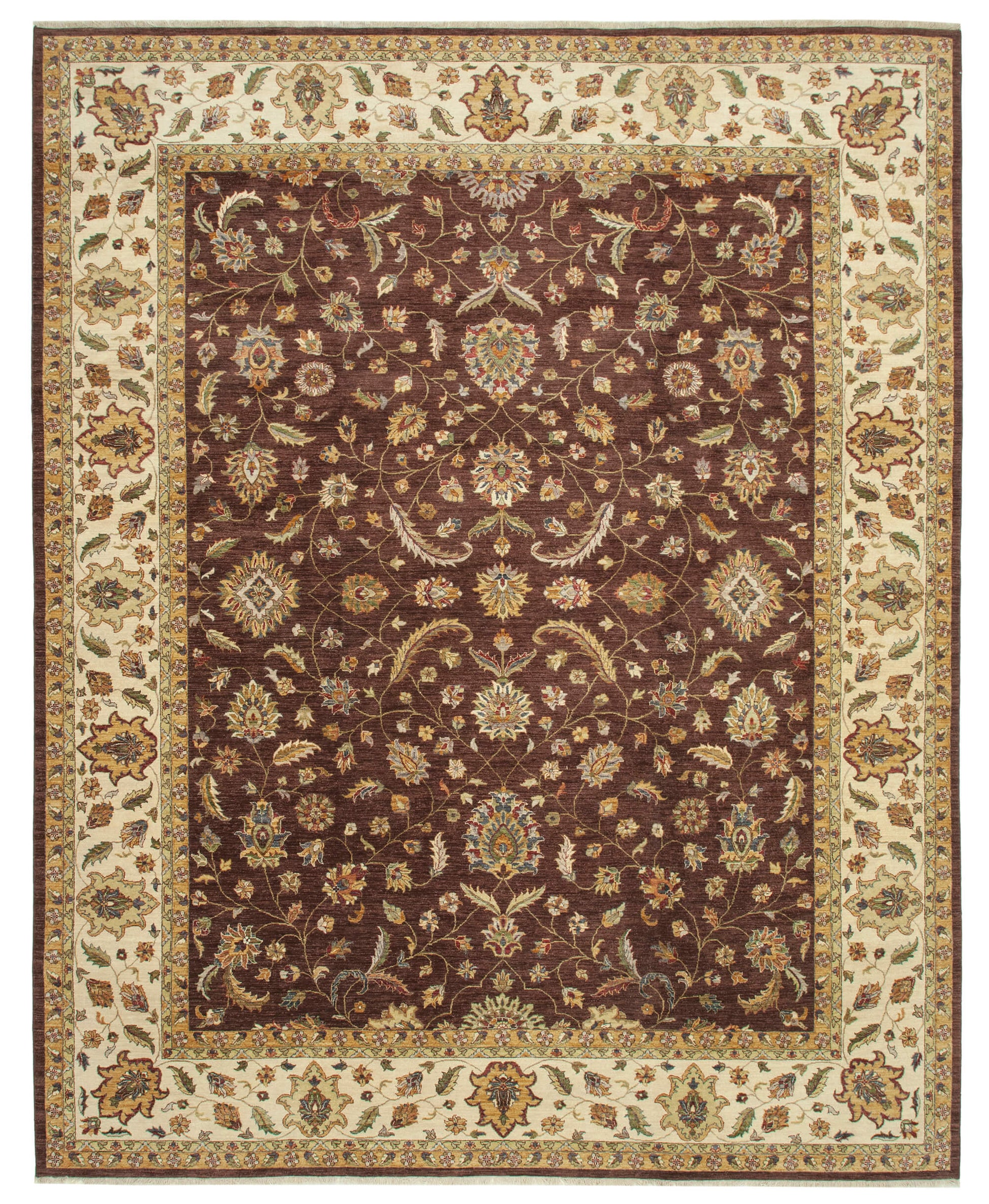 The intricate design of this handwoven rug is a celebration of traditional motifs and patterns. The rich brown background is adorned with an array of floral and vine patterns, meticulously crafted to create a harmonious and visually appealing composition. The border, in a complementary beige, frames the central design beautifully, adding depth and contrast. The use of cotton and wool in the weft and warp ensures a soft yet resilient texture, while the rug's age of 10-20 years adds a touch of vintage charm. This piece is not just a rug; it's a work of art that tells a story of heritage and craftsmanship.