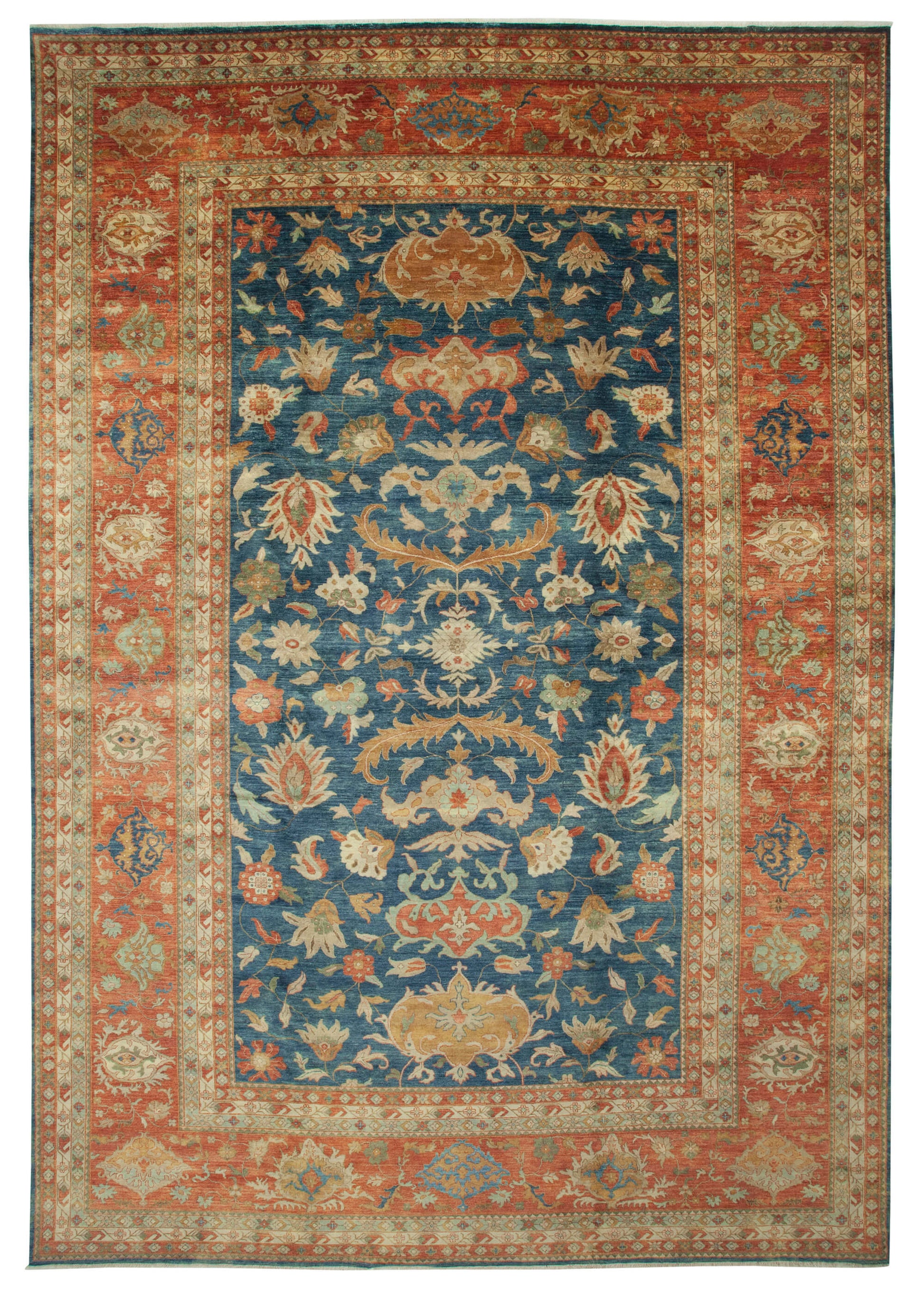 The intricate design of this rug is a celebration of artistry and color. Featuring a rich palette of beige, blue, and terracotta, it brings warmth and vibrancy to your home. The central field is adorned with elegant floral motifs and symmetrical patterns, creating a harmonious balance. The border, with its detailed geometric designs, frames the rug beautifully, enhancing its visual appeal. This handwoven piece showcases the skillful interplay of weft and warp, resulting in a texture that is both soft and resilient.