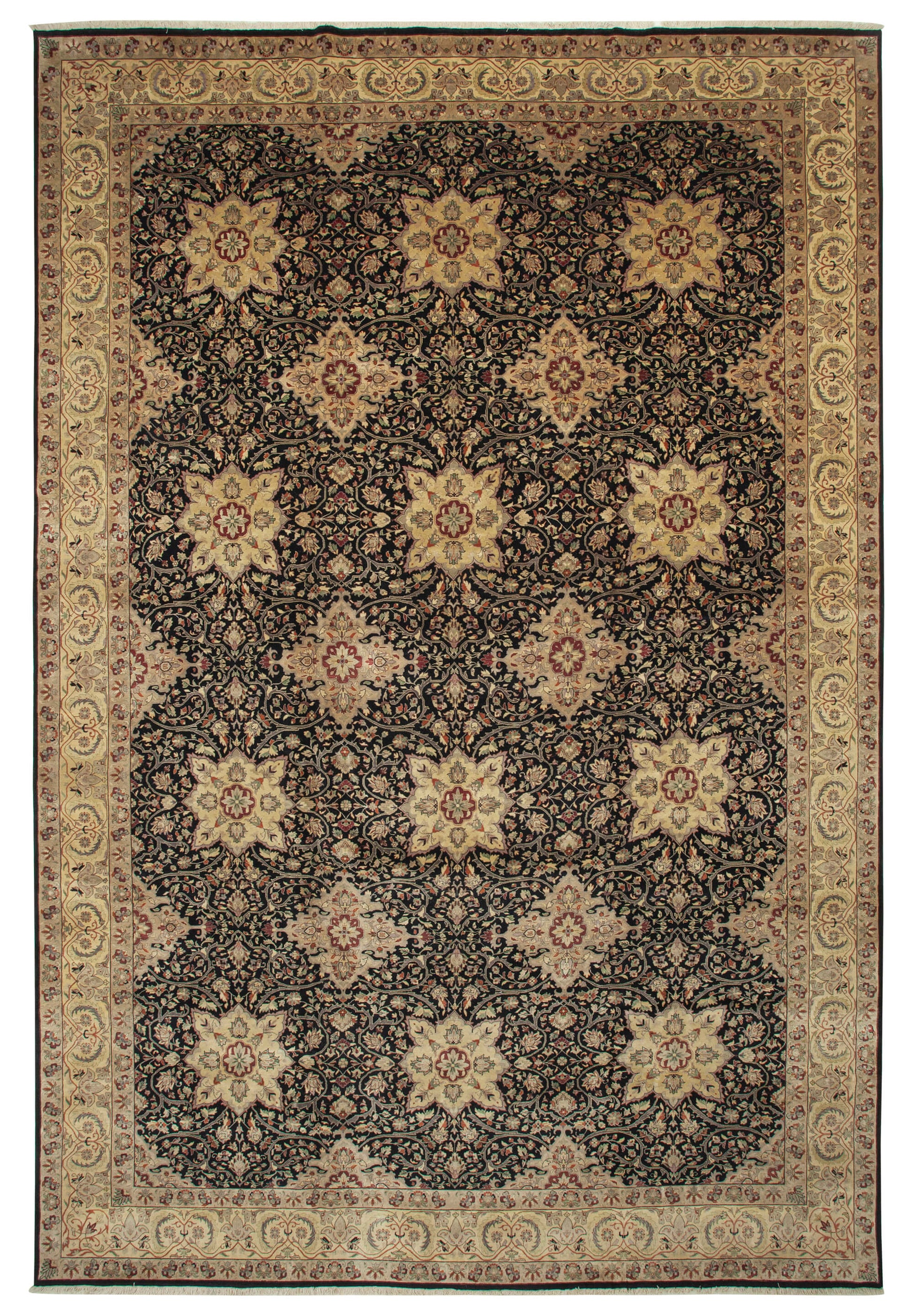 The intricate design of this rug is a testament to the skill of its artisans. Featuring a harmonious blend of beige and black, the rug's pattern is both sophisticated and versatile. The central motif is a series of ornate floral medallions, each surrounded by delicate vine-like details that create a sense of movement and depth. The border is adorned with an elegant scrollwork pattern, adding a touch of refinement. This rug's color palette and design make it a perfect fit for both contemporary and traditional interiors, offering a seamless blend of old-world charm and modern aesthetics.