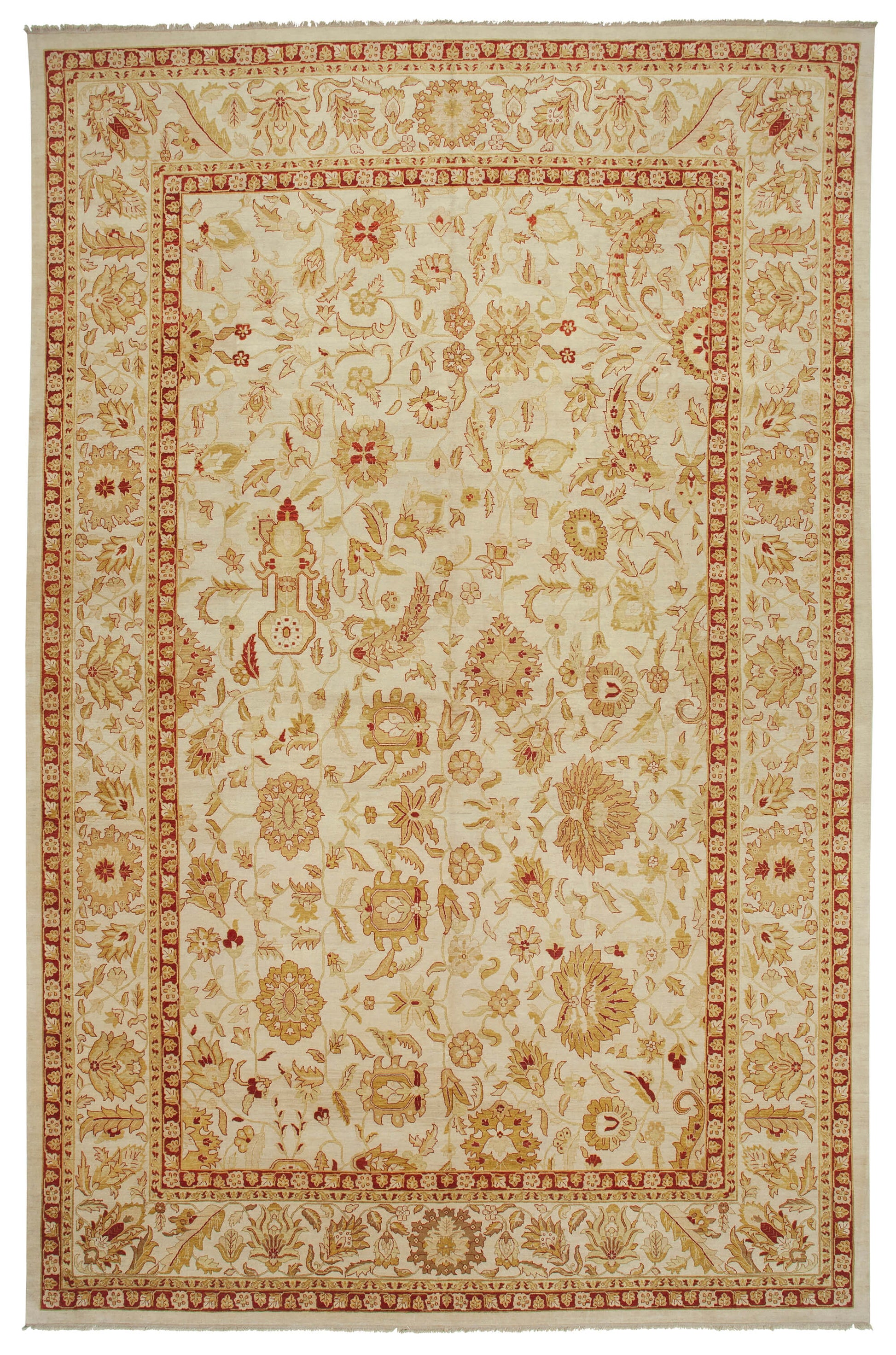 The rug features a captivating design with a harmonious blend of beige and red hues. The intricate floral patterns are meticulously woven, showcasing the skill and artistry of the weavers. The border, adorned with detailed motifs, frames the central design beautifully, adding depth and character. The use of wool and cotton not only enhances the texture but also ensures the rug's resilience and longevity. The warm color palette of beige and red creates a cozy and inviting atmosphere, making it a perfect centerpiece for your living room, dining area, or bedroom.