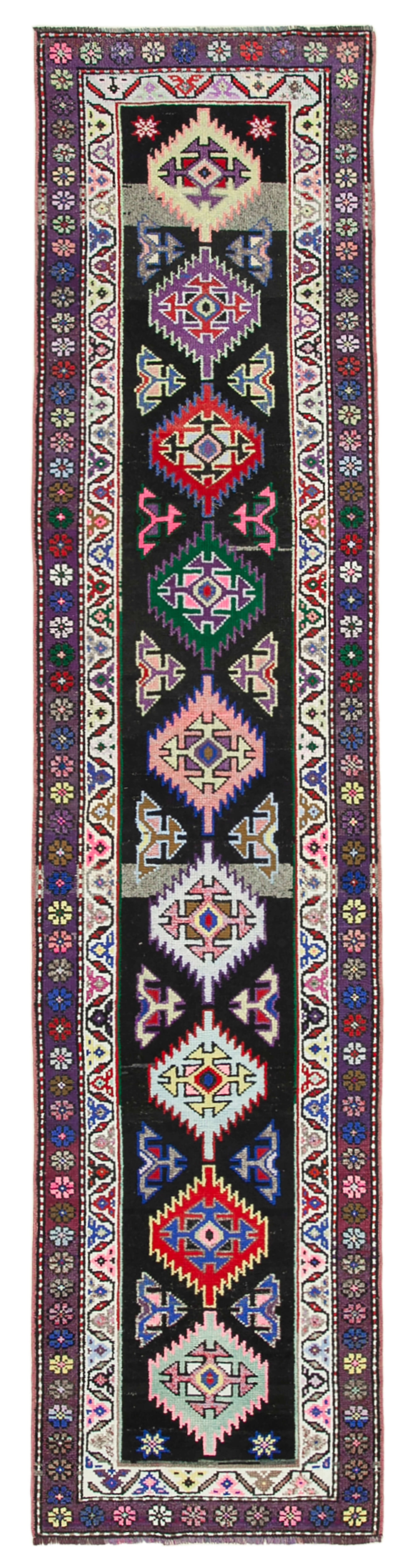Step into a world of timeless elegance with our exquisite handwoven rug, a masterpiece that embodies the rich heritage of traditional craftsmanship. Measuring 12'7'' (384 cm) in length and 2'11'' (88 cm) in width, this rug is a perfect blend of artistry and functionality. Crafted with a weft and warp of cotton and wool, it boasts a thickness of approximately 0.39'' (10 mm), offering both durability and comfort. With an age of 40-60 years, this rug is not just a decorative piece but a slice of history, featuring a captivating palette of purple, black, and vibrant accents.