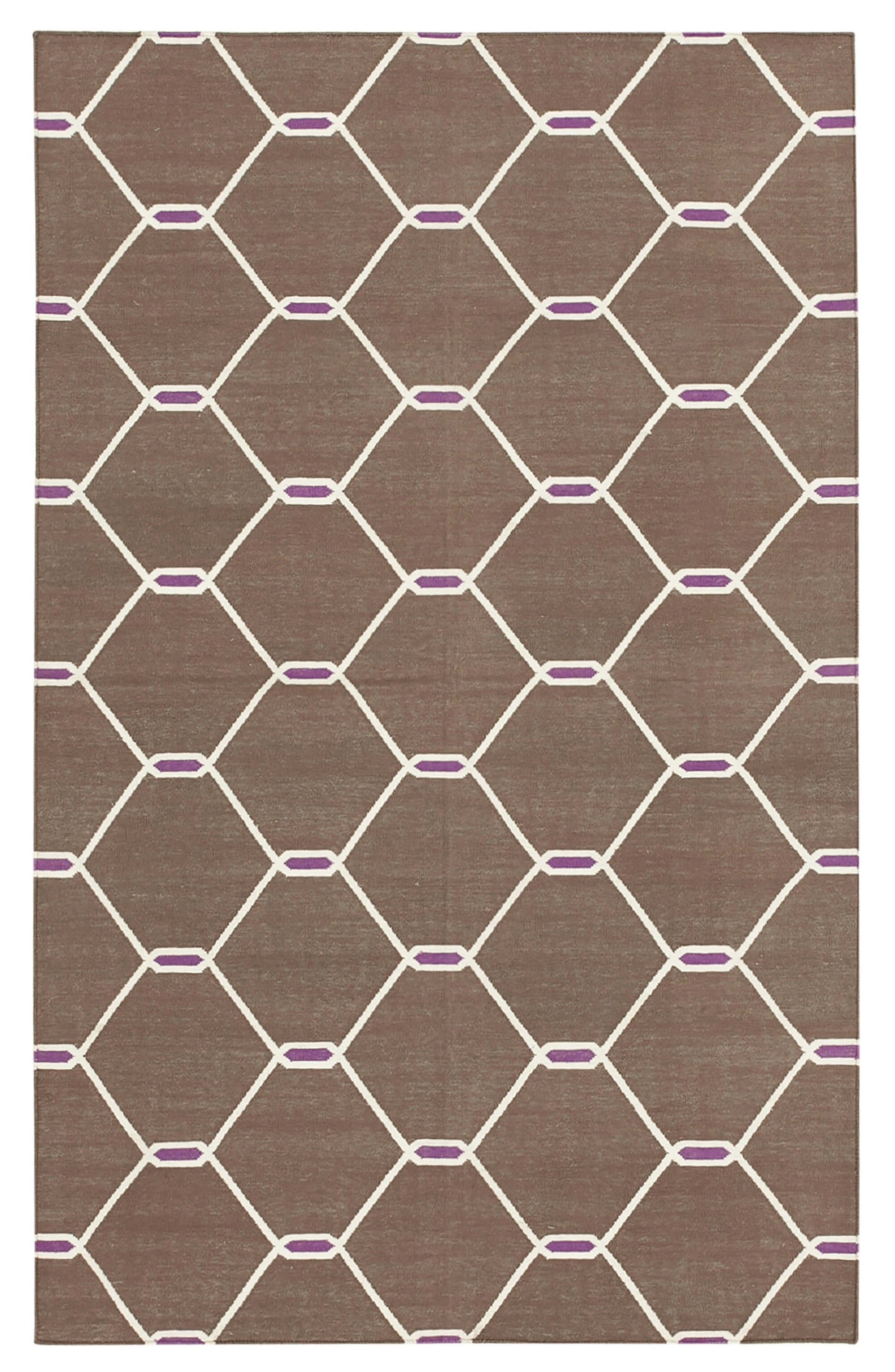 The design of this rug is a harmonious blend of classic and contemporary elements. The rich brown color serves as a warm and inviting base, while the intricate pattern of interlocking diamonds adds a touch of sophistication. Accents of purple and cream create a striking contrast, enhancing the visual appeal of the rug. The use of cotton and wool in the weft and warp ensures a soft texture and long-lasting quality. This rug is not just a floor covering; it's a piece of art that transforms any space into a stylish haven.