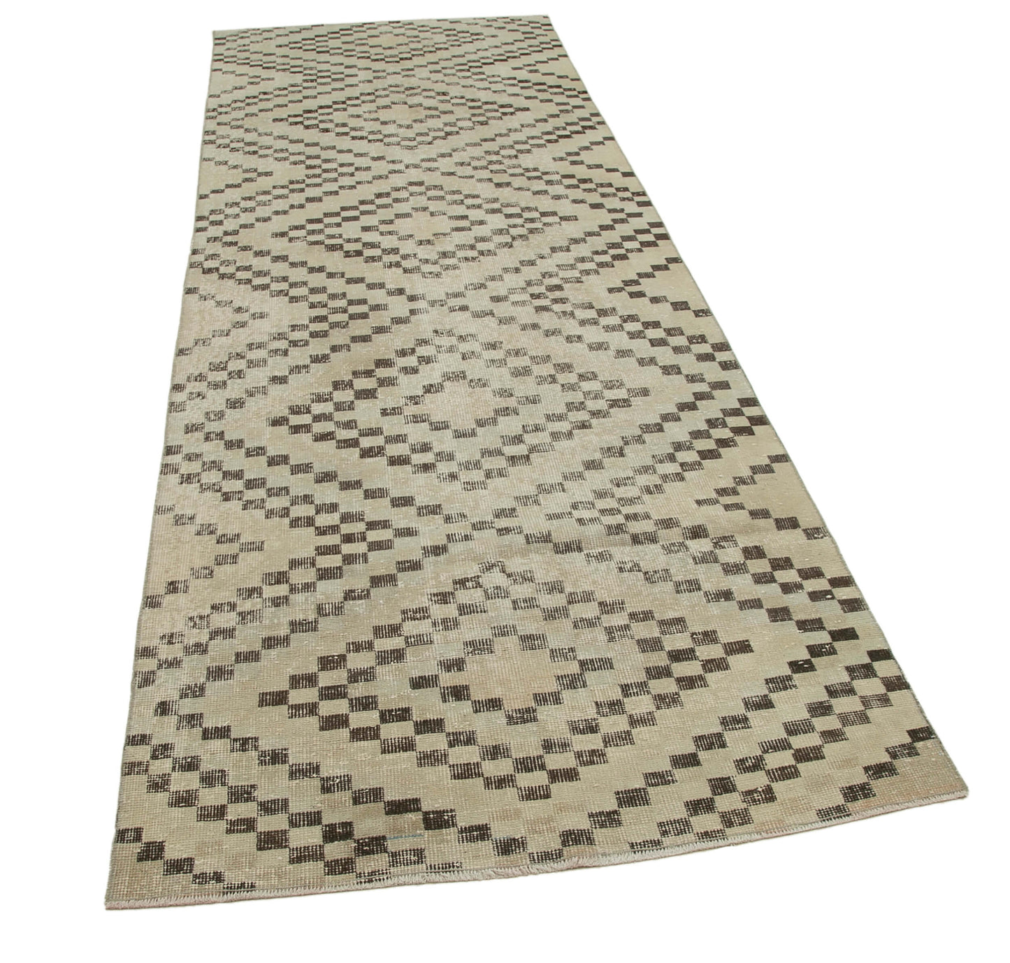 Discover the timeless elegance of our exquisite handwoven rug, a masterpiece that combines traditional craftsmanship with modern aesthetics. Measuring 11'1'' (338 cm) in length and 3'8'' (113 cm) in width, this rug is a perfect addition to any space seeking a touch of sophistication. Crafted with a blend of cotton and wool, its weft and warp construction ensures durability and comfort underfoot. With an age range of 30-70 years, this rug carries a rich history, adding character and charm to your home. The subtle thickness of approximately 0.20'' (5.00 mm) provides a plush feel, while the harmonious blend of beige and brown tones creates a warm and inviting atmosphere.