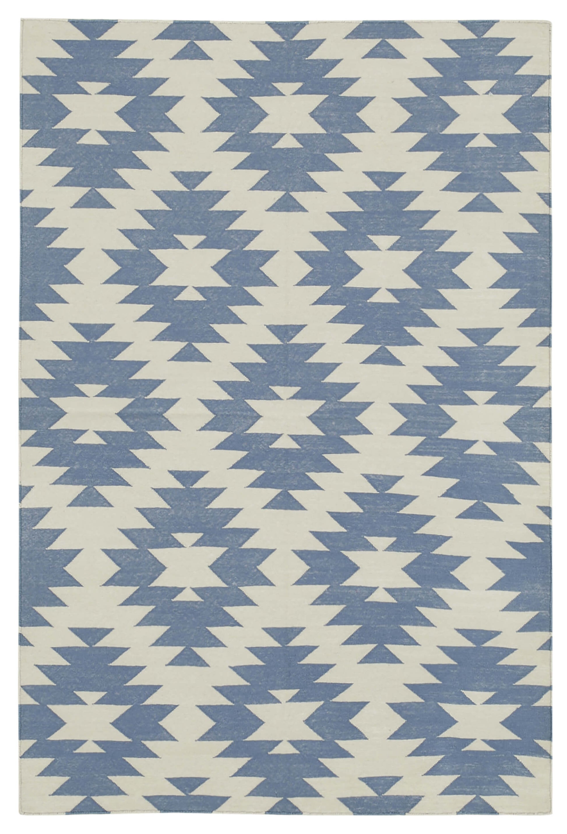 The design of this rug is a harmonious blend of blue and white hues, creating a striking geometric pattern that captivates the eye. The intricate weft and warp, made from high-quality cotton and wool, showcase the skill and dedication of the artisans. With a thickness of approximately 0.24'' (6.00 mm), it provides a plush feel underfoot while maintaining its structural integrity. The color palette, featuring shades of blue and white, offers versatility, allowing it to complement a wide range of interior styles, from contemporary to classic.