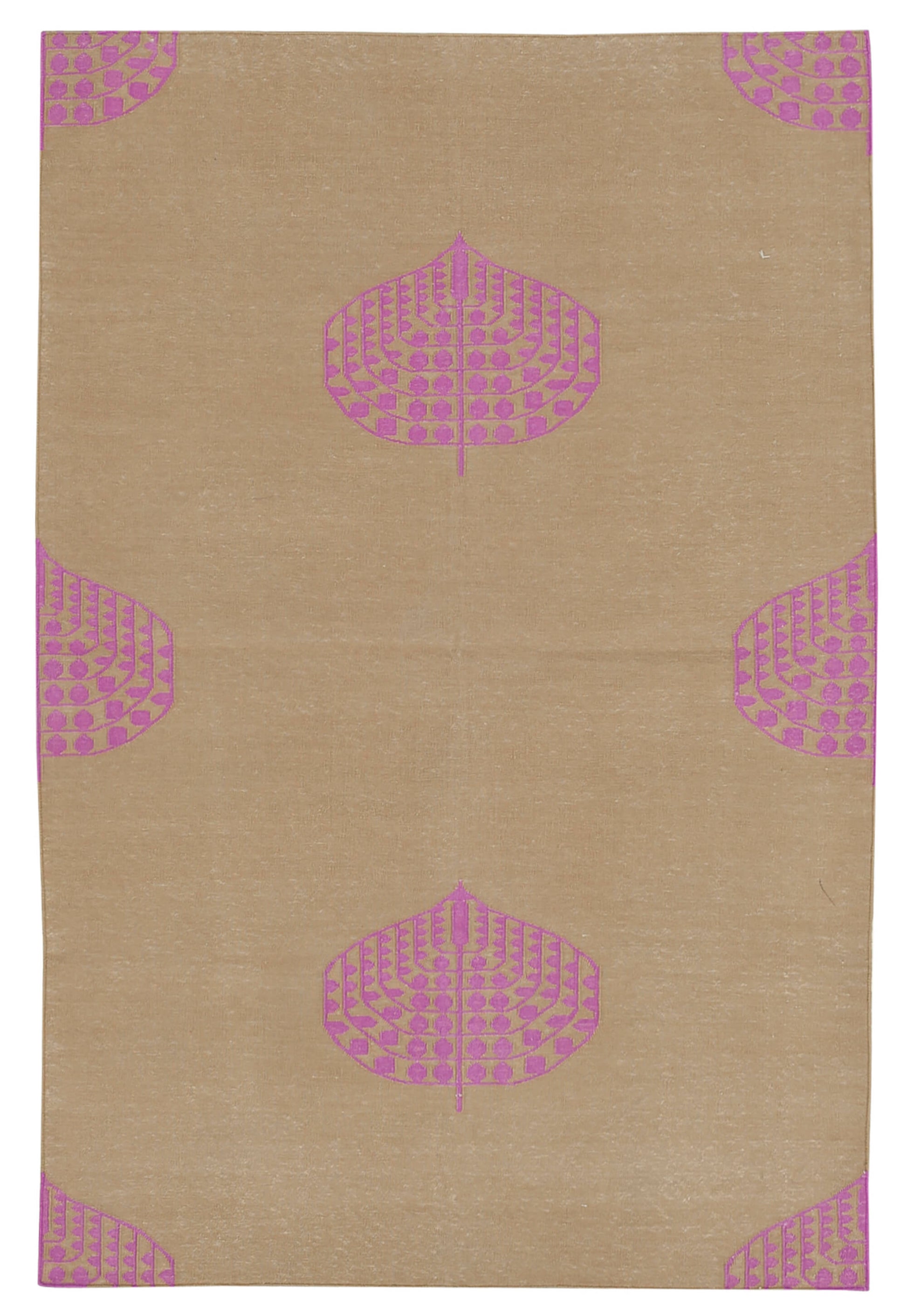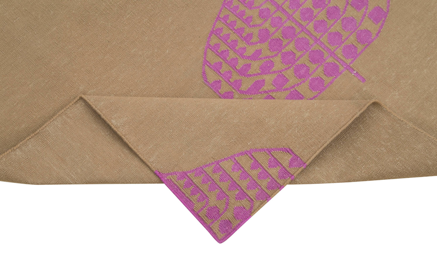 The design of this rug is a harmonious blend of earthy tones and vibrant accents. The primary color is a warm brown, complemented by striking pink patterns that add a pop of color and visual interest. The intricate leaf motifs are meticulously woven, showcasing the skill and artistry of the weavers. The cotton and wool composition ensures a soft texture, while the robust construction promises longevity. This rug is not just a floor covering; it is a piece of art that enhances the ambiance of your home.