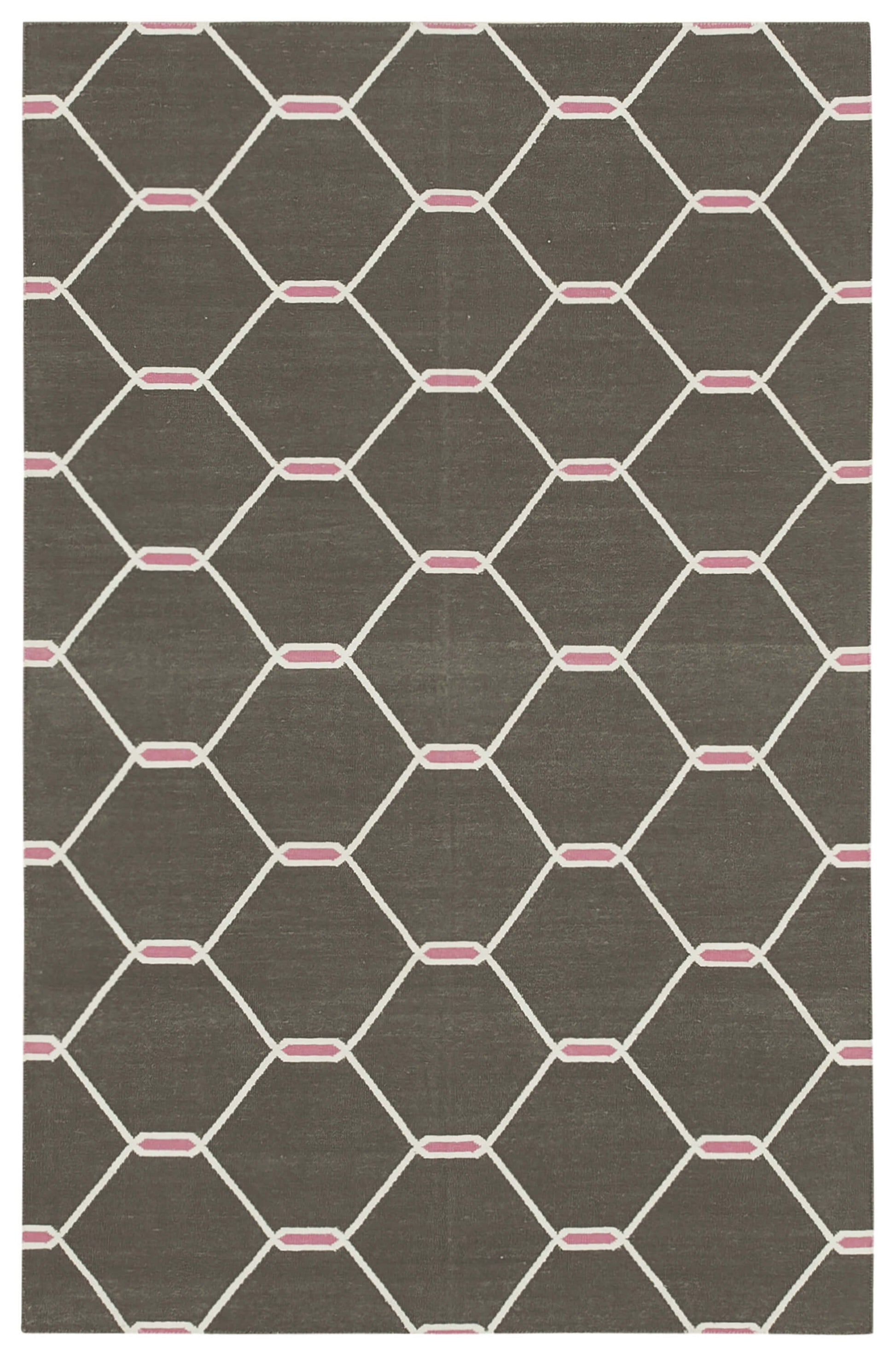 The design of this rug is both striking and versatile, featuring a harmonious blend of brown, white, and subtle pink accents. The geometric pattern, with its interlocking diamond shapes, creates a sense of movement and depth, drawing the eye and adding interest to any space. The use of cotton and wool in the weft and warp not only ensures longevity but also provides a natural, breathable texture that enhances the overall aesthetic. The color palette is carefully chosen to complement a wide range of interior styles, from modern minimalism to rustic charm.