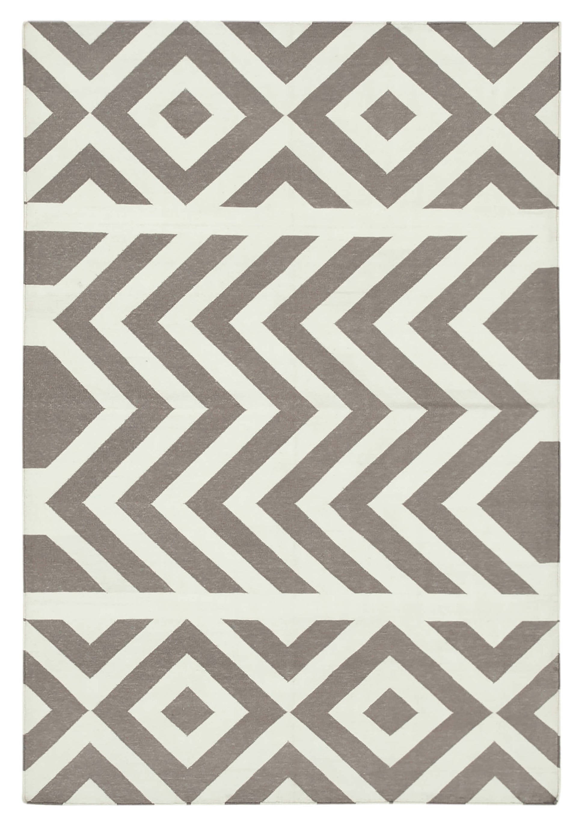 The rug features a striking geometric pattern in a sophisticated palette of brown and white. The bold, angular design creates a dynamic visual impact, making it a statement piece in any setting. The use of high-quality cotton and wool not only enhances its durability but also adds a luxurious texture. The neutral colors allow for versatile styling, seamlessly blending with various decor themes, from contemporary to rustic. Its timeless design ensures it remains a cherished part of your home for years to come.