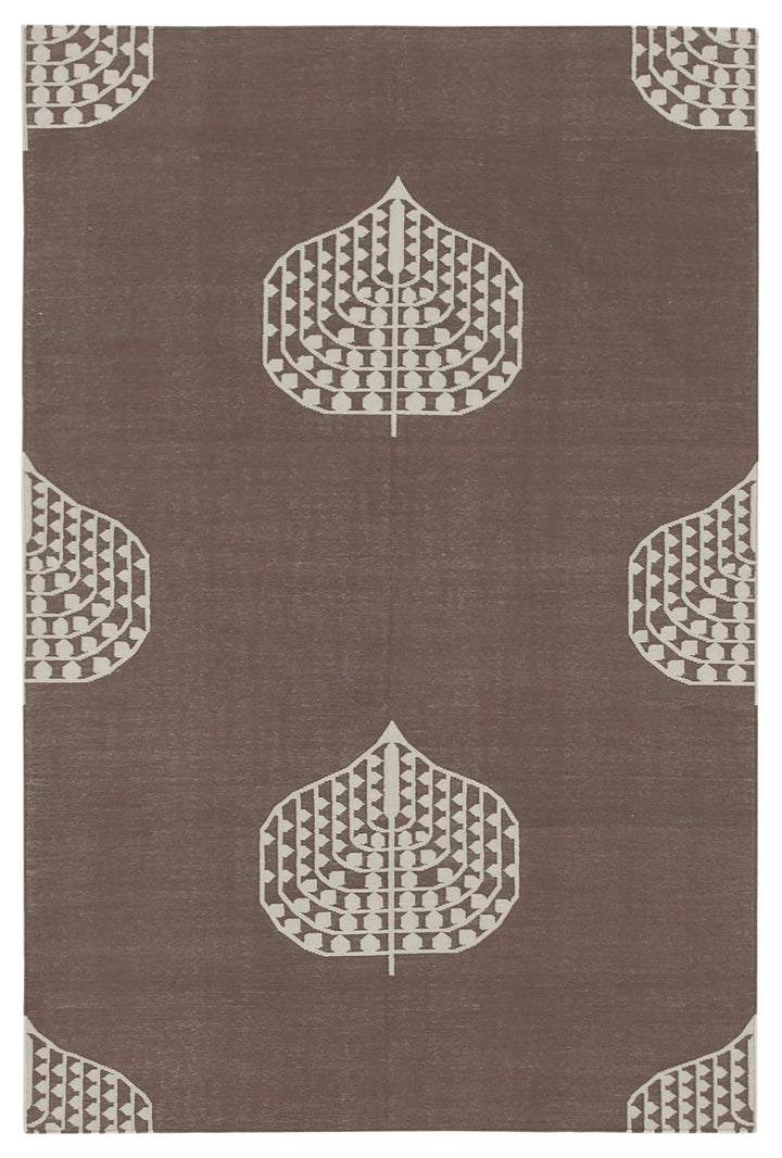 The design of this handwoven rug is a testament to the skill and artistry of its creators. Featuring a striking pattern of geometric shapes, the rug's intricate motifs are woven with precision, creating a harmonious balance between the bold brown background and the delicate white accents. The use of cotton and wool in the weft and warp ensures durability and resilience, allowing the rug to withstand the test of time while maintaining its beauty. The subtle interplay of colors and textures adds depth and dimension, making it a focal point in any room. Whether placed in a living room, bedroom, or study, this rug enhances the aesthetic appeal of your space.