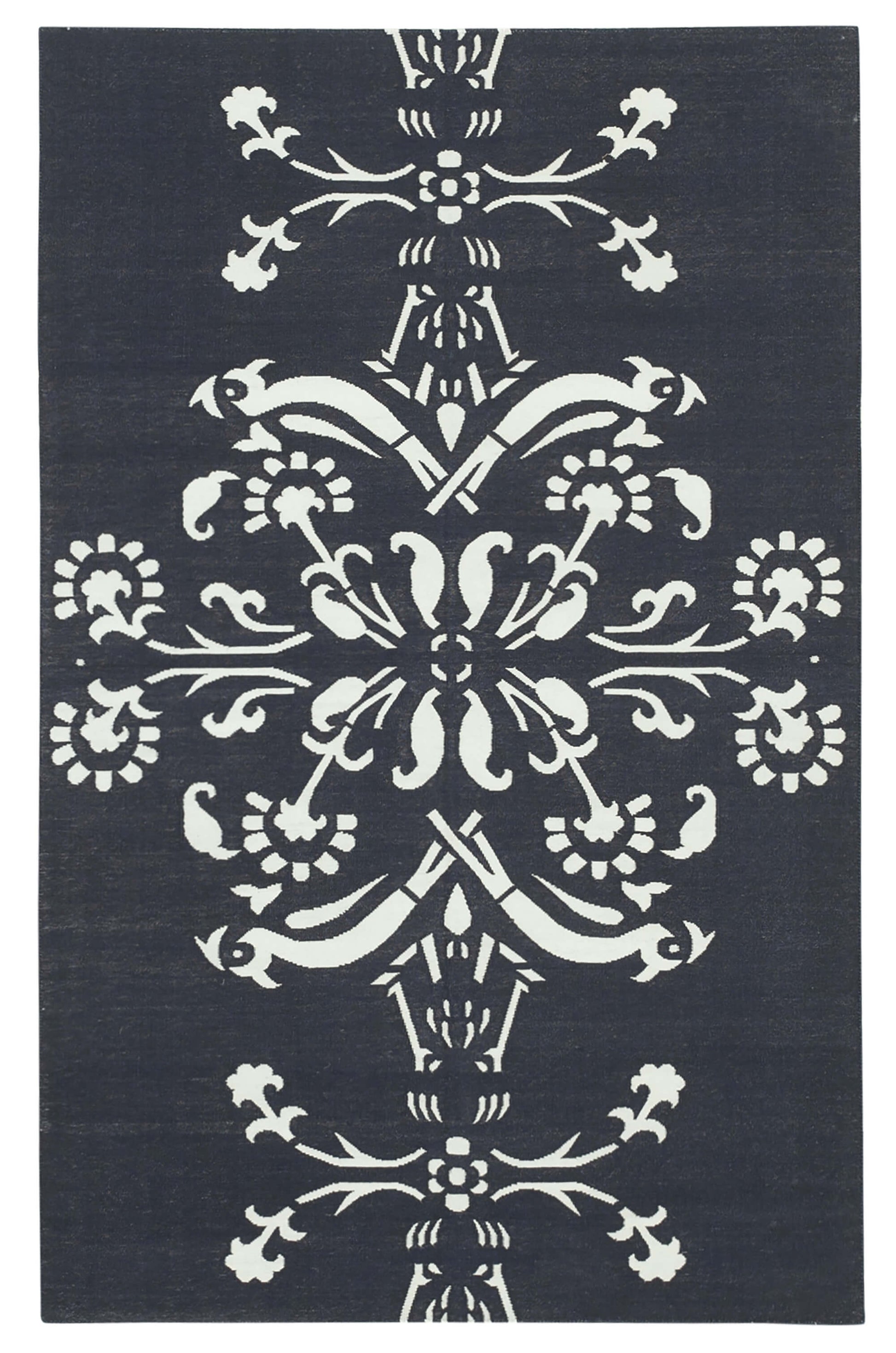 The rug features a striking black and white pattern that exudes sophistication and style. The intricate design showcases a harmonious blend of floral and geometric motifs, creating a visual centerpiece that captivates the eye. The use of high-quality cotton and wool in the weft and warp ensures a soft yet resilient texture, making it ideal for high-traffic areas. The monochromatic color scheme allows for versatile styling, seamlessly integrating with various interior design themes, from contemporary to classic.