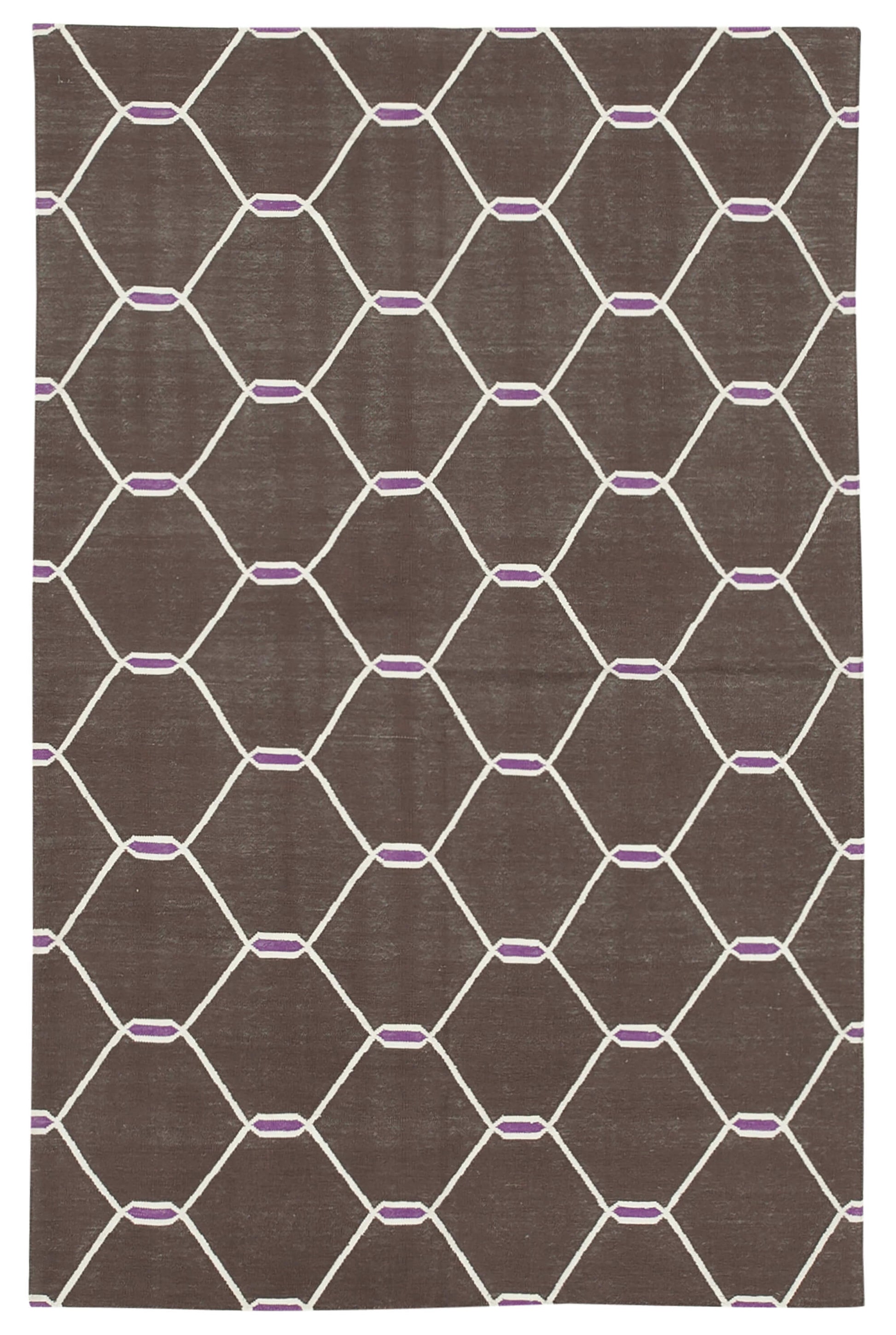 The design of this rug is a harmonious blend of classic and contemporary elements. The rich brown background is adorned with an intricate geometric pattern, featuring interlocking lines in white and subtle accents of purple. This color palette not only adds depth and sophistication but also makes it versatile enough to complement a variety of interior styles. The use of cotton and wool in the weft and warp provides a robust structure, ensuring that this rug will be a cherished part of your home for years to come.