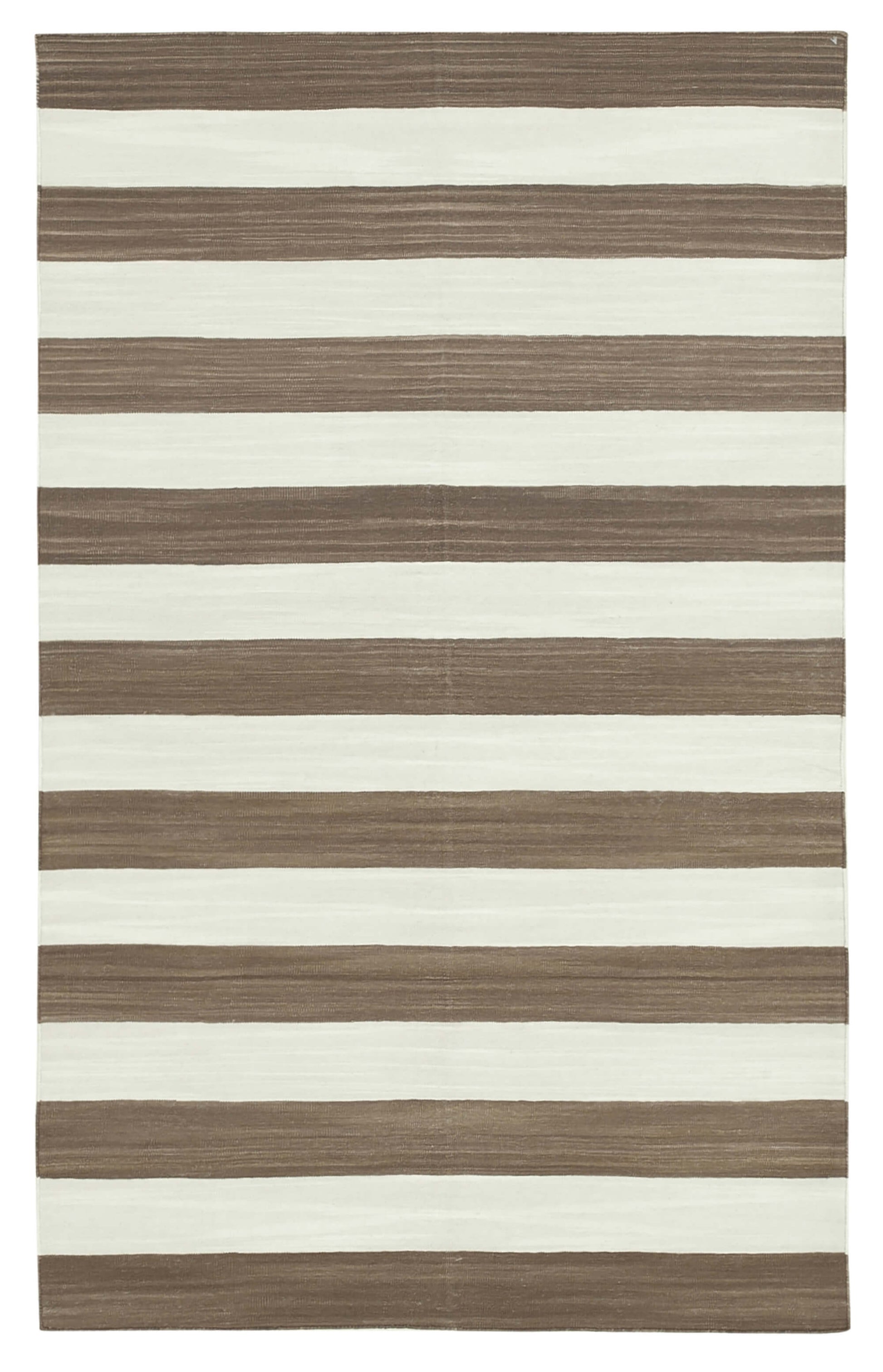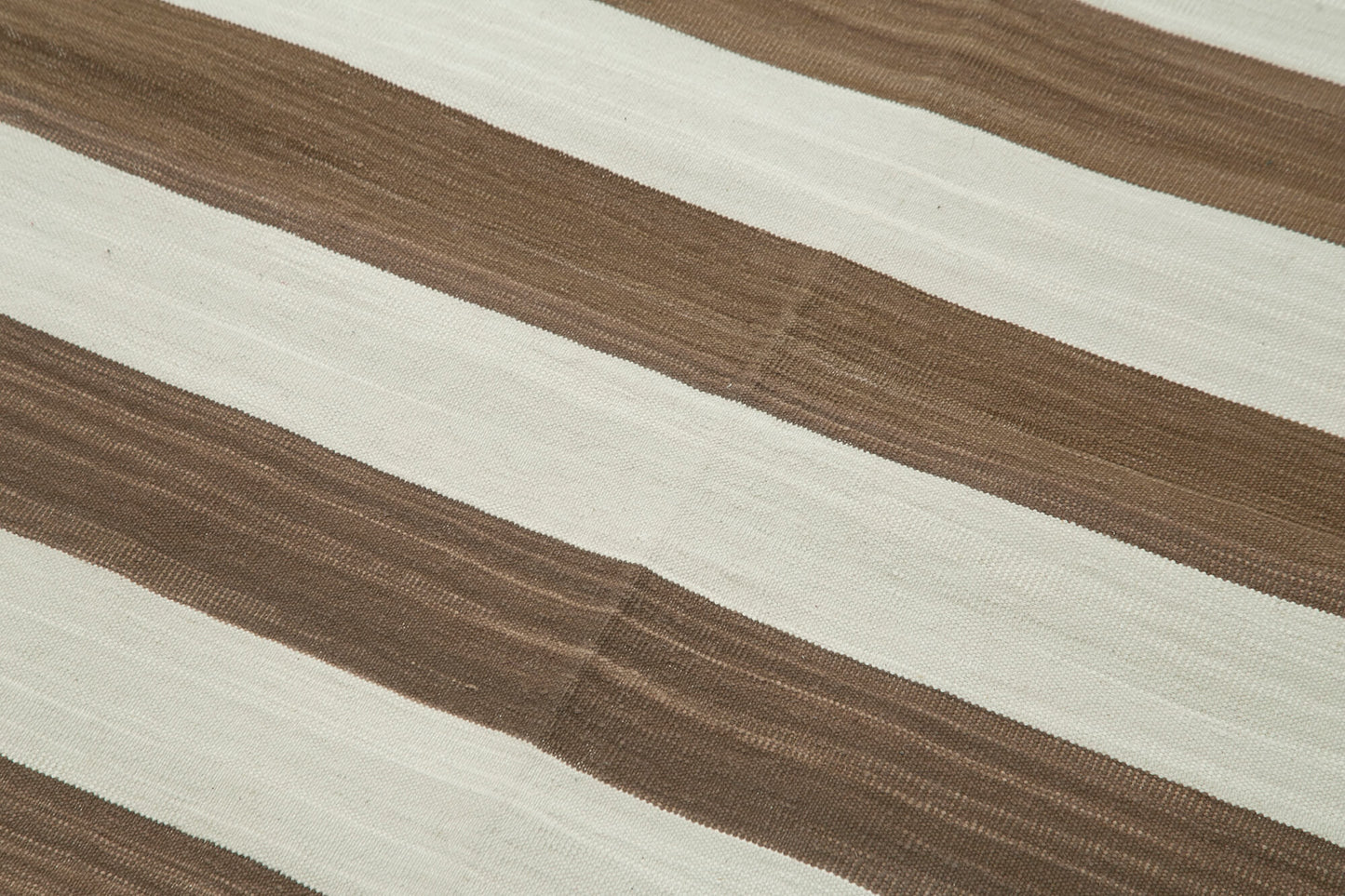 The design of this handwoven rug is a harmonious blend of earthy tones, featuring alternating stripes of brown and white. The subtle color palette makes it versatile, allowing it to complement a wide range of interior styles, from rustic to contemporary. The weft and warp are meticulously crafted from cotton and wool, ensuring a robust structure that withstands daily use. With a thickness of approximately 0.24'' (6.00 mm), it offers a comfortable cushioning effect while maintaining a sleek profile. The rug's age adds a vintage charm, making it a unique piece that tells its own story.