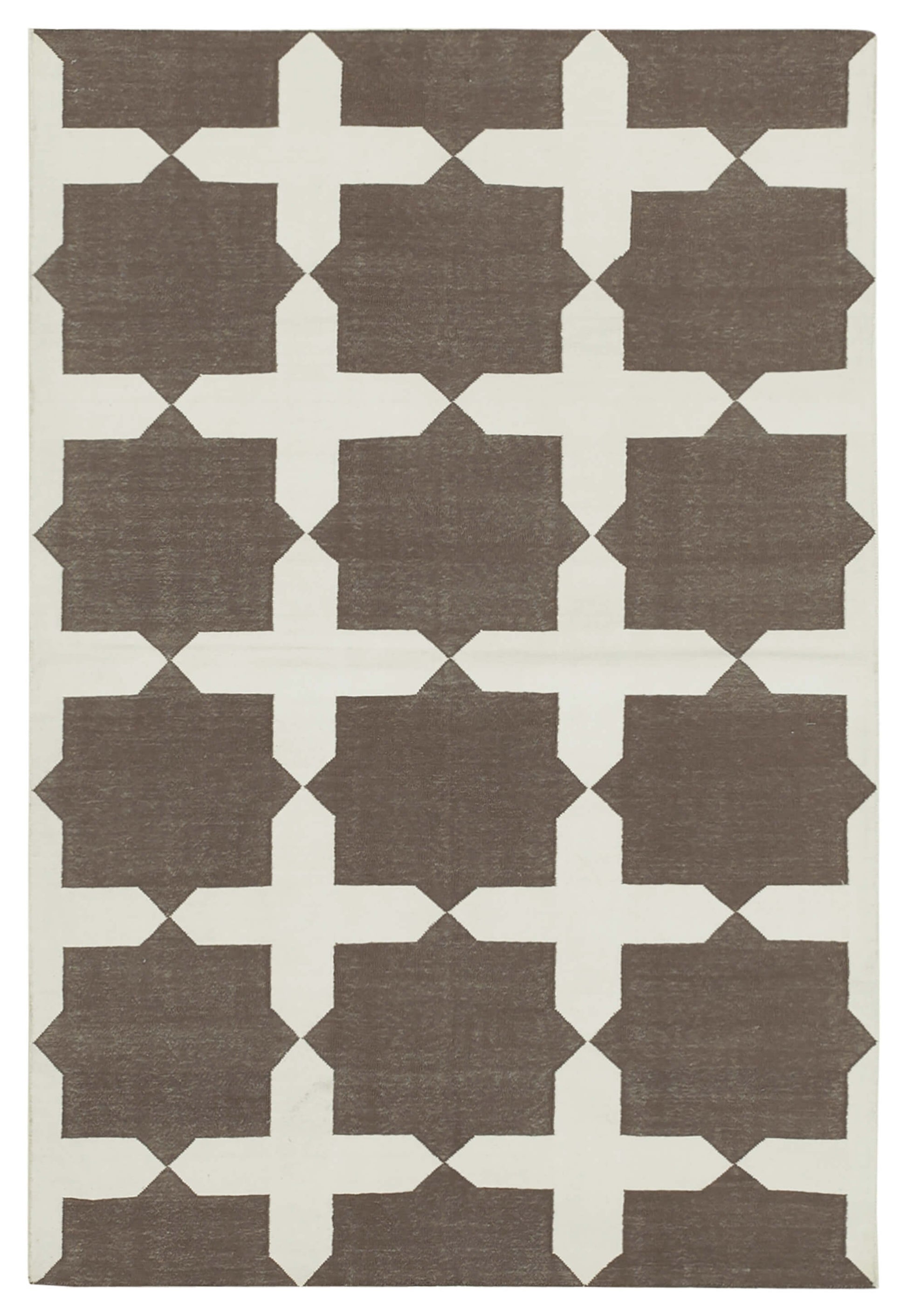 The rug features a striking geometric pattern in a harmonious blend of brown and white tones. The intricate design is a testament to the skill of the artisans who crafted it, with each motif meticulously woven to create a balanced and eye-catching aesthetic. The cotton and wool weft and warp ensure durability and resilience, making it suitable for high-traffic areas. The neutral color palette allows it to seamlessly integrate into various decor styles, from contemporary to rustic, enhancing the visual appeal of your space.