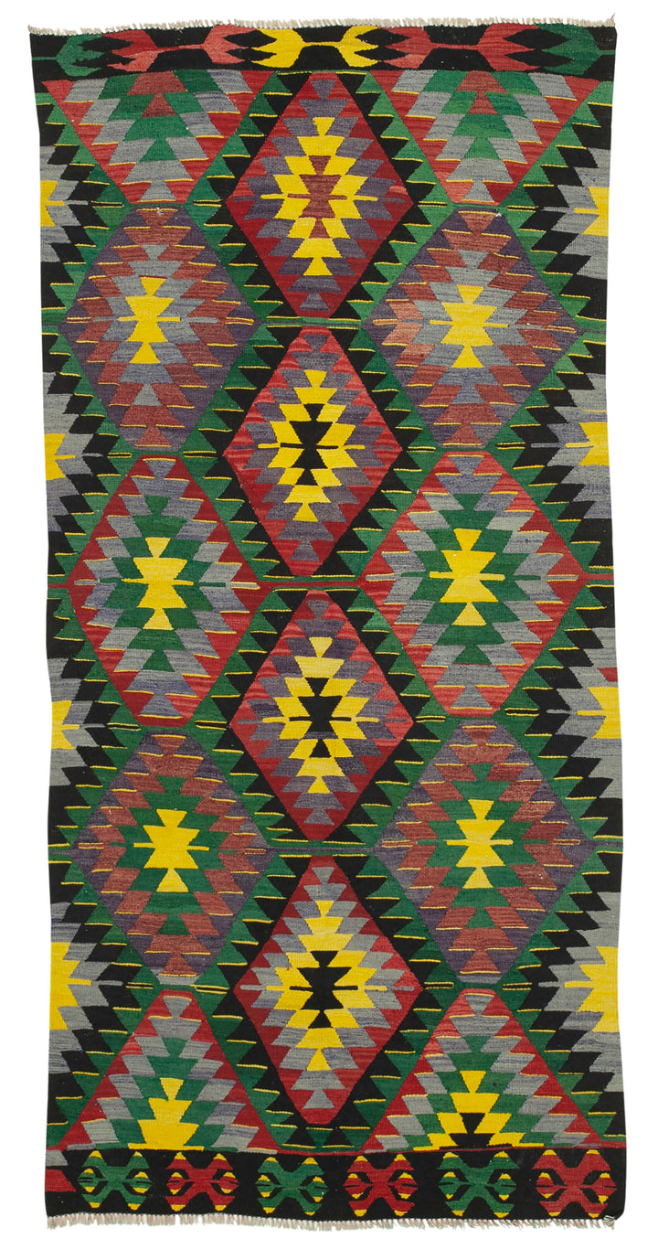 This handwoven rug features a stunning geometric design, characterized by bold diamond patterns that draw the eye and create a sense of movement. The vibrant palette of yellow, green, and red is expertly woven into the cotton and wool weft and warp, ensuring durability and a soft texture underfoot. With a thickness of approximately 0.24'' (6.00 mm), it provides a comfortable and luxurious feel. The harmonious blend of colors and shapes reflects a deep cultural significance, making it not just a decorative item but a piece of art that tells a story.