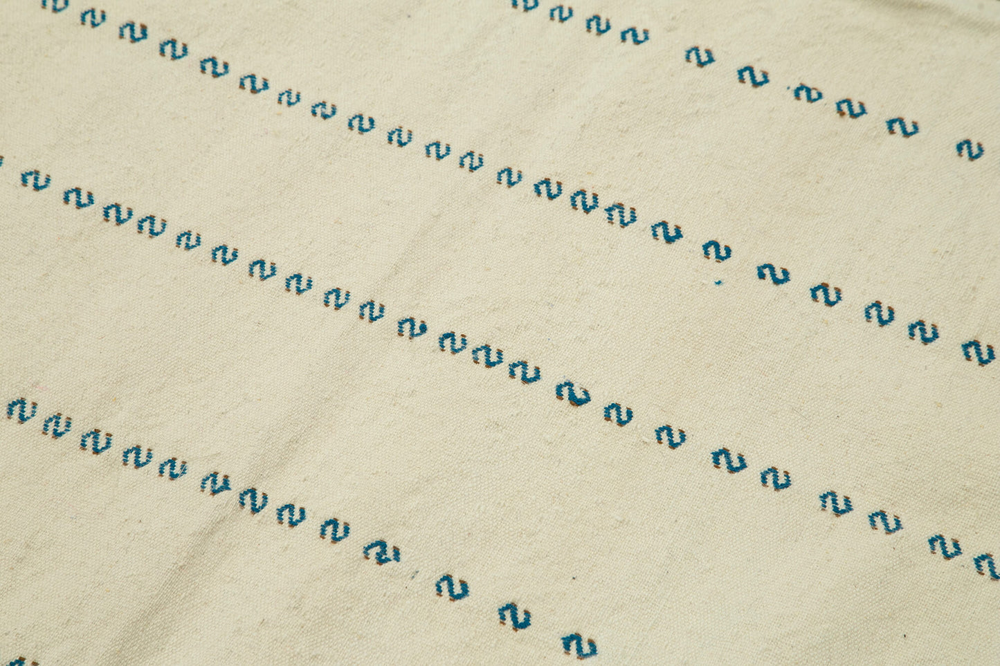 This handwoven rug features a delicate interplay of white and blue hues, creating a serene and inviting atmosphere. The weft and warp are composed of high-quality cotton and wool, ensuring durability and comfort underfoot. With an age of 40-50 years, this rug carries a rich history, adding a sense of heritage to your decor. Its thickness of approximately 0.24'' (6.00 mm) provides a plush feel, making it ideal for both decorative and practical purposes. The subtle yet striking design is perfect for those who appreciate understated elegance and timeless beauty.