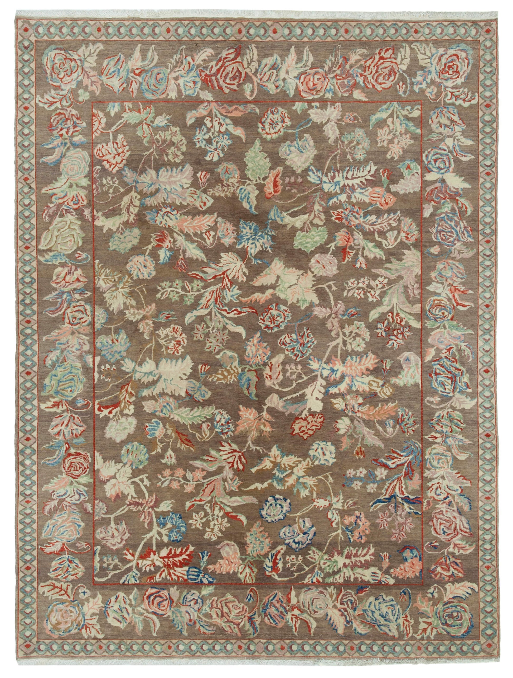 The design of this rug is a harmonious blend of earthy tones, featuring a palette of brown and beige hues. The intricate floral patterns are meticulously woven, showcasing a stunning array of leaves and blossoms that create a sense of movement and life. The border is adorned with a series of elegant floral motifs, adding a touch of sophistication. This rug's design is not only visually appealing but also versatile, complementing a variety of interior styles from classic to contemporary. Its natural colors and detailed patterns make it a standout piece that can anchor any room.