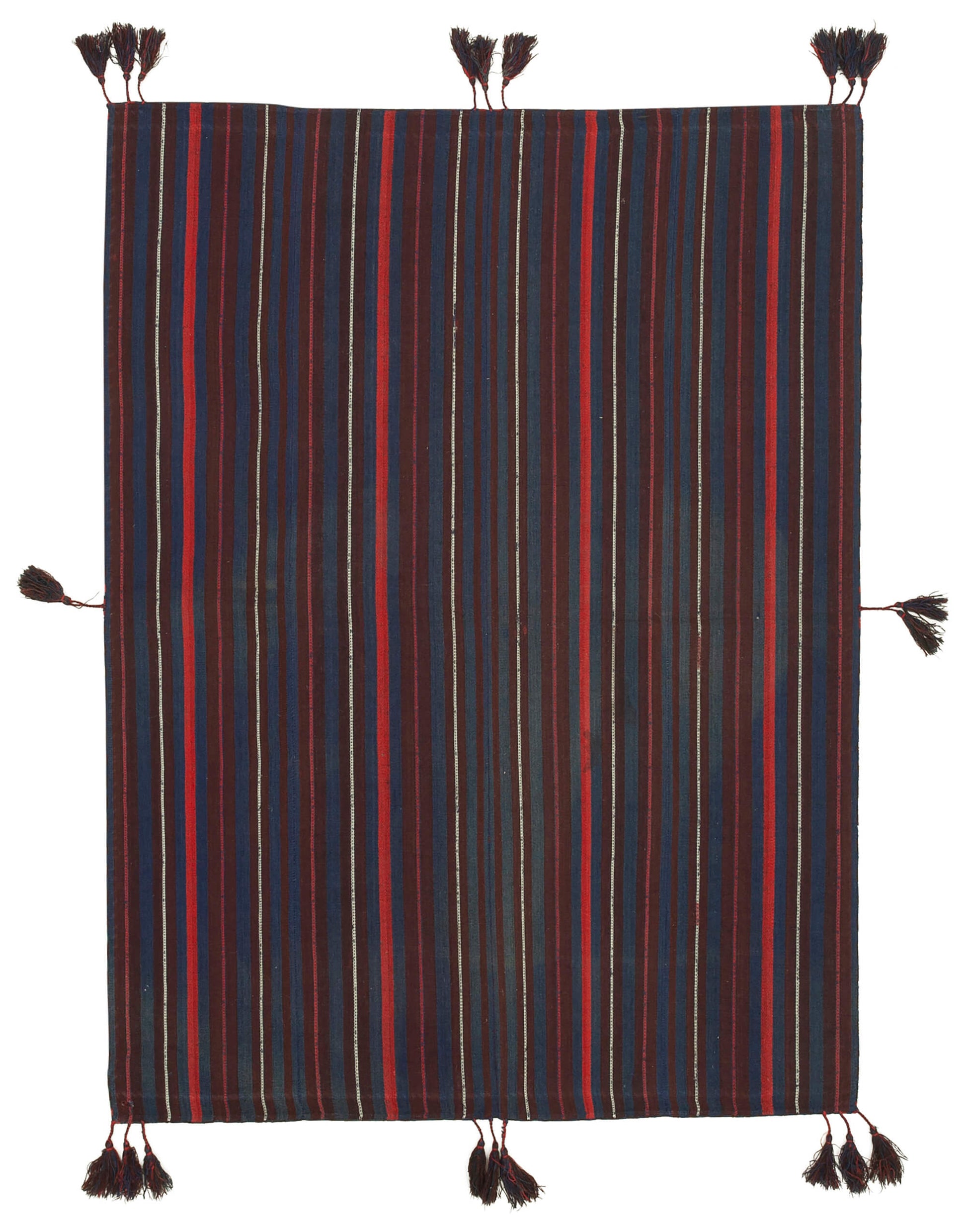 This handwoven rug features a captivating design that blends rich colors and textures. The weft and warp are made from a harmonious blend of cotton and wool, providing a soft yet resilient surface. The color palette includes deep shades of purple and red, creating a striking visual impact. The alternating stripes of these colors add a dynamic element, making the rug a focal point in any room. The tassels on the edges further enhance its traditional appeal, offering a touch of elegance and sophistication.