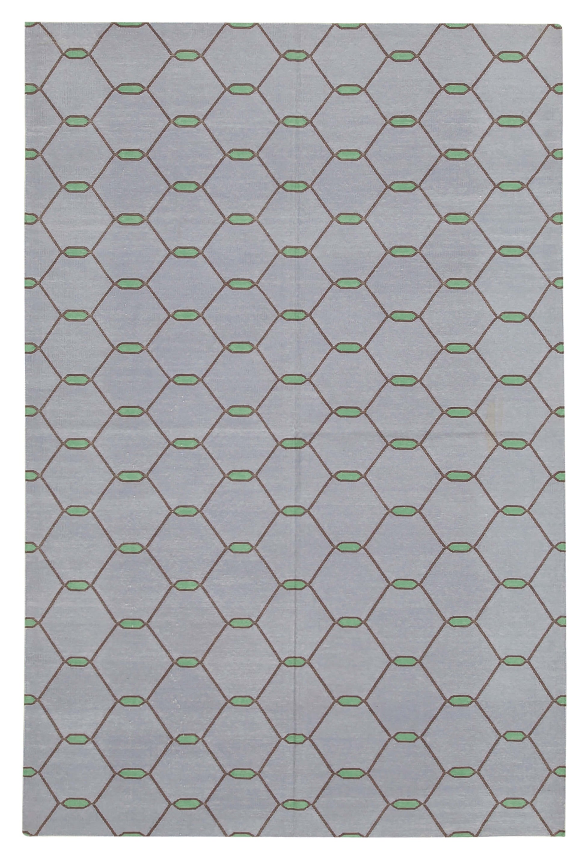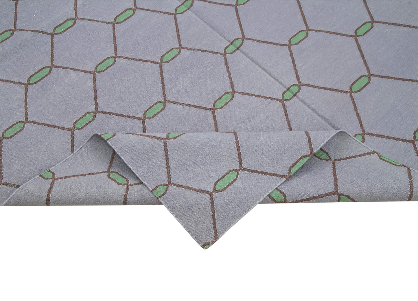 The rug features a captivating geometric pattern, with interlocking diamond shapes that create a sense of movement and depth. The color palette includes soothing shades of purple and green, which are expertly woven into the design, adding a touch of elegance and sophistication. The use of cotton and wool in the weft and warp ensures durability and resilience, making it suitable for high-traffic areas. The intricate craftsmanship is evident in every detail, reflecting the skill and dedication of the artisans who created it.