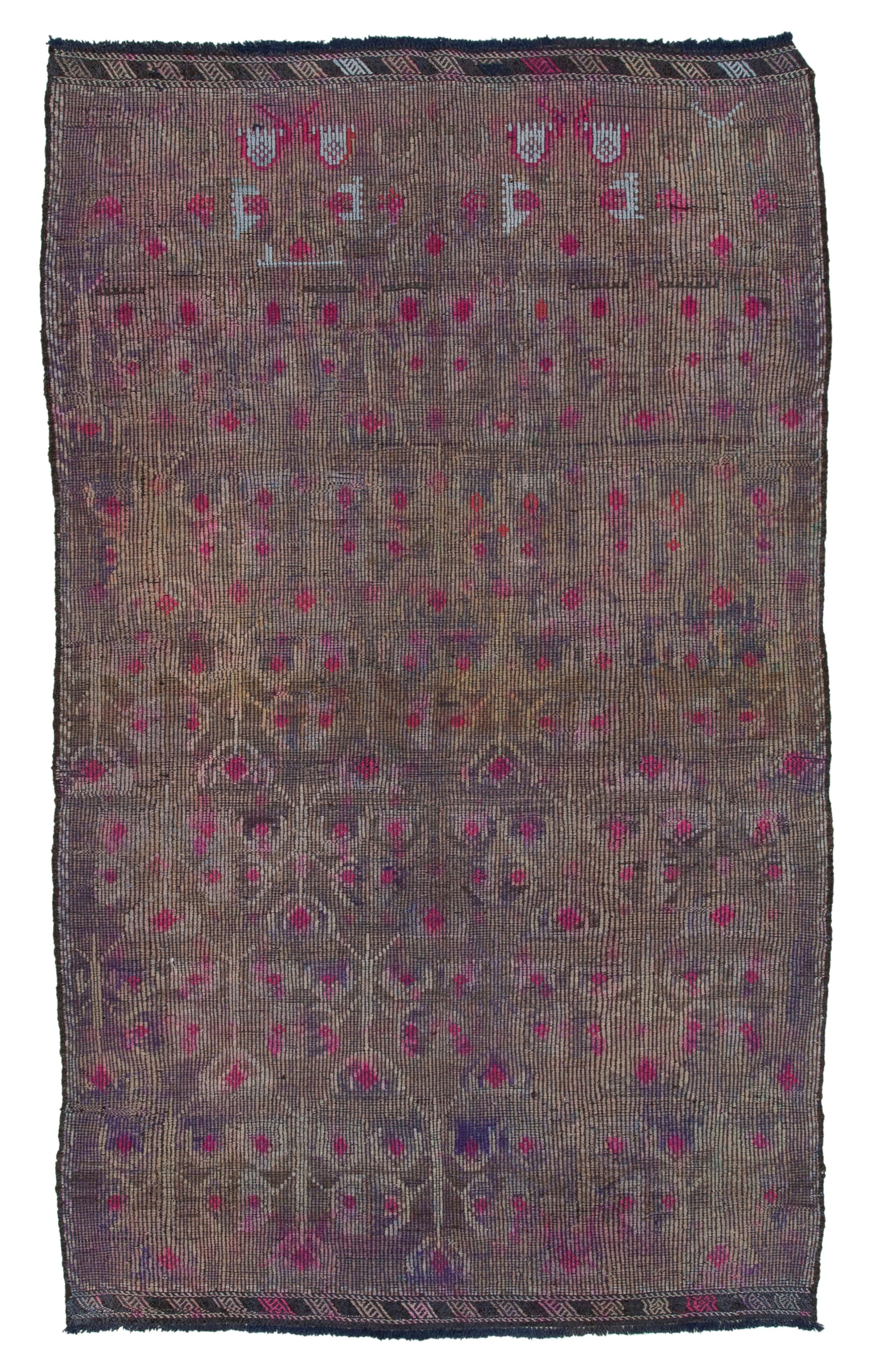 The design of this handwoven rug is a captivating blend of tradition and subtlety. Its intricate patterns are highlighted by a palette of deep purples and other complementary hues, creating a harmonious visual experience. The use of goat hair in both the weft and warp adds a unique texture, enhancing the rug's tactile appeal. The aged appearance, with its slight variations in color and pattern, tells a story of its own, making each piece truly one-of-a-kind. This rug is not just a floor covering; it's a piece of art that brings warmth and character to any room.