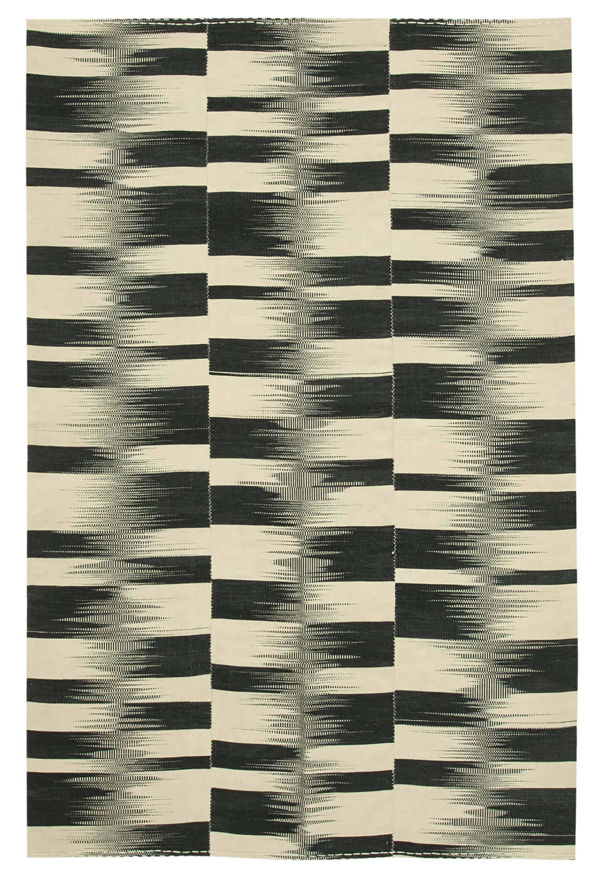 The design of this rug is a harmonious blend of black and beige tones, creating a striking visual impact. The pattern features a series of bold, horizontal stripes that add a sense of movement and depth to the piece. The use of cotton and wool in the weft and warp not only enhances its durability but also gives it a luxurious texture. The color palette of black and beige is versatile, allowing it to complement a wide range of interior styles, from contemporary to classic. This rug is not just a floor covering; it's a statement piece that will draw attention and admiration.