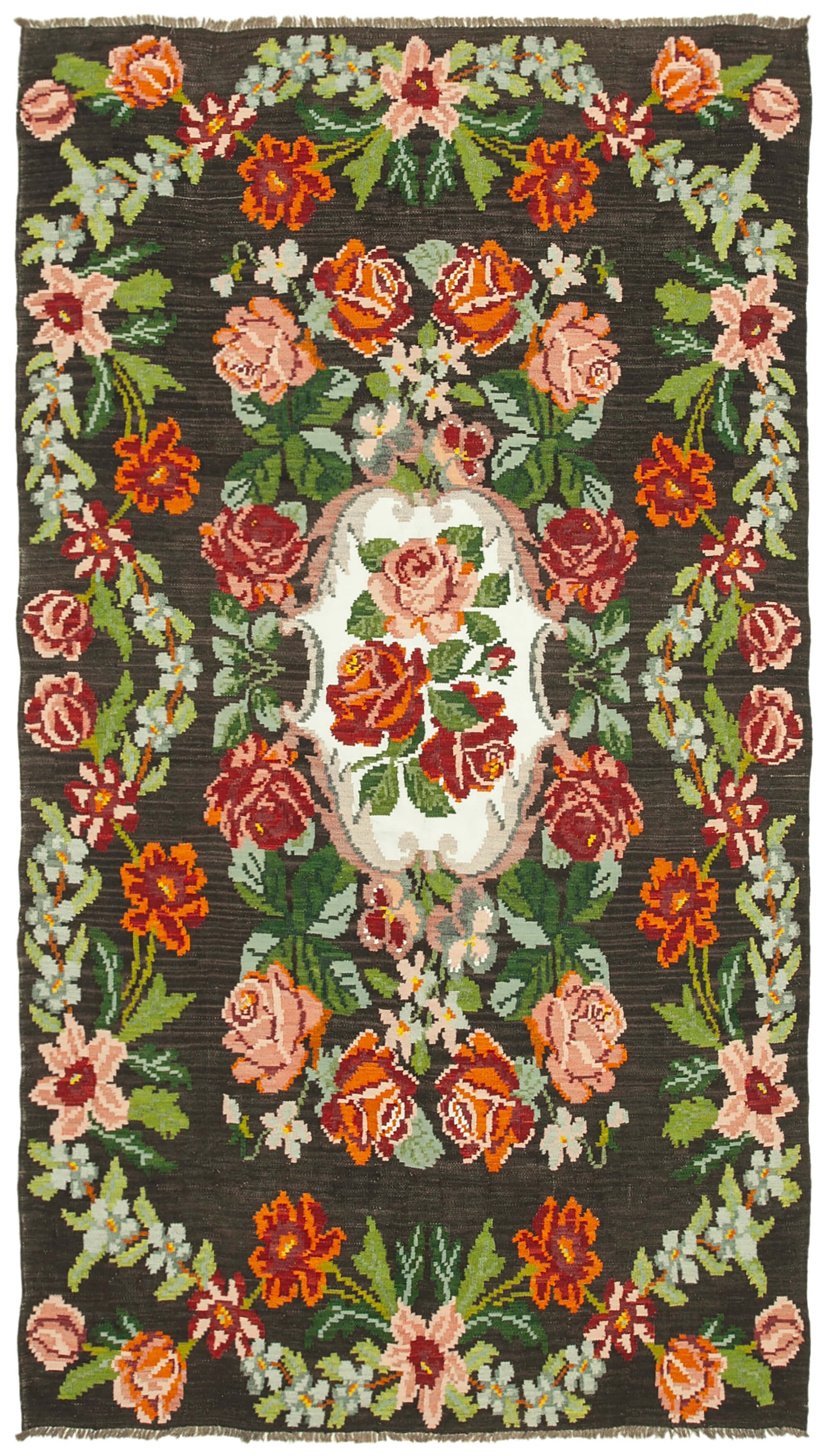 The design of this handwoven rug is a celebration of floral motifs, featuring an array of vibrant colors including black, orange, pink, and green. The intricate patterns of roses and other blossoms are set against a deep black background, creating a striking contrast that draws the eye. The thickness of approximately 0.24'' (6.00 mm) adds a plush feel, enhancing the comfort and warmth it brings to your home. Each flower is meticulously crafted, showcasing the skillful artistry of the weavers. The harmonious blend of colors and patterns makes this rug a versatile piece that complements both traditional and contemporary interiors.