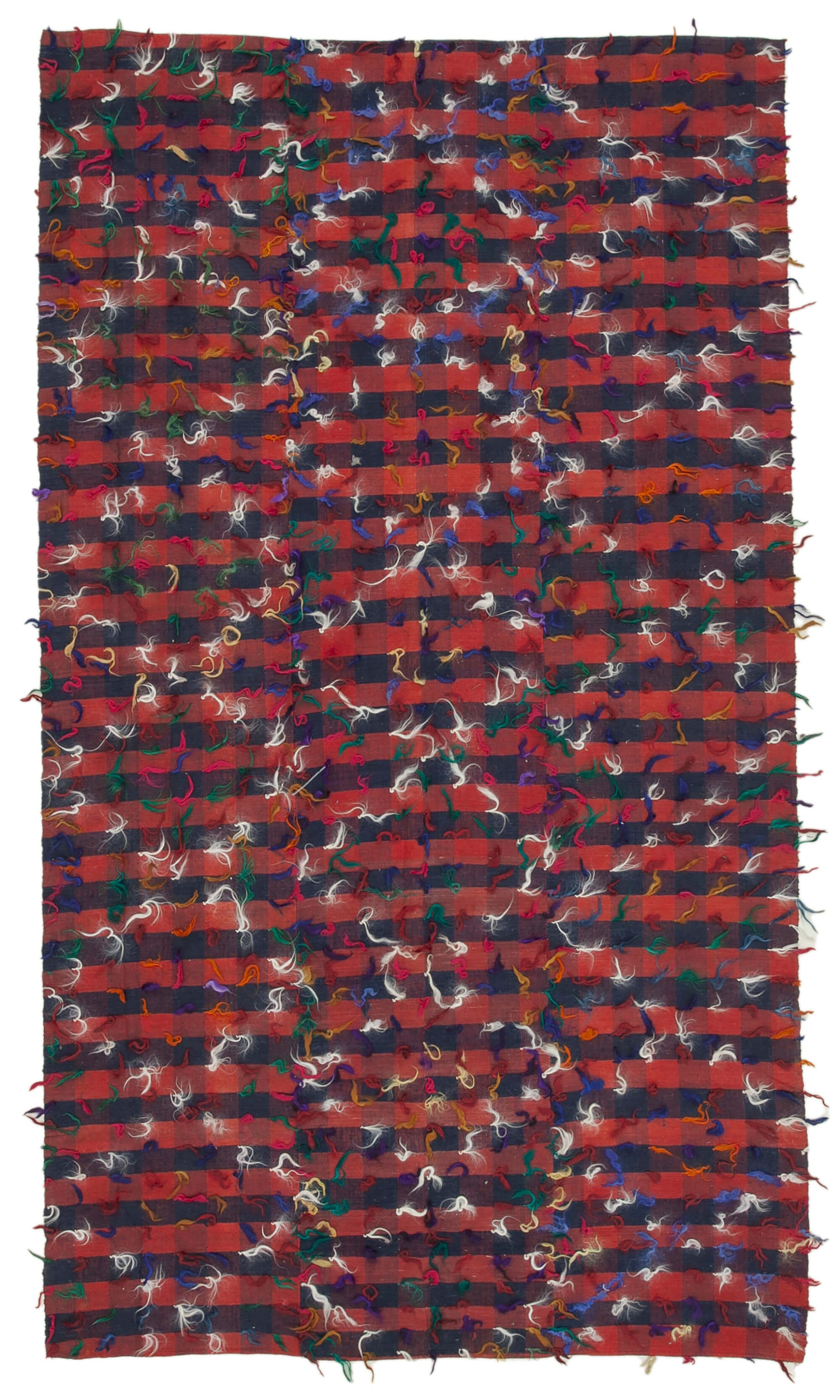 The design of this handwoven rug is a vibrant tapestry of colors and textures. Dominated by rich reds and deep blues, the rug features an intricate pattern that captures the eye and sparks the imagination. The interplay of colors is enhanced by the subtle variations in the wool and cotton fibers, creating a dynamic visual effect. With a thickness of approximately 0.24'' (6.00 mm), the rug provides a plush surface that is both comfortable and resilient. Its age and craftsmanship are evident in the fine details, making it a unique addition to any collection.