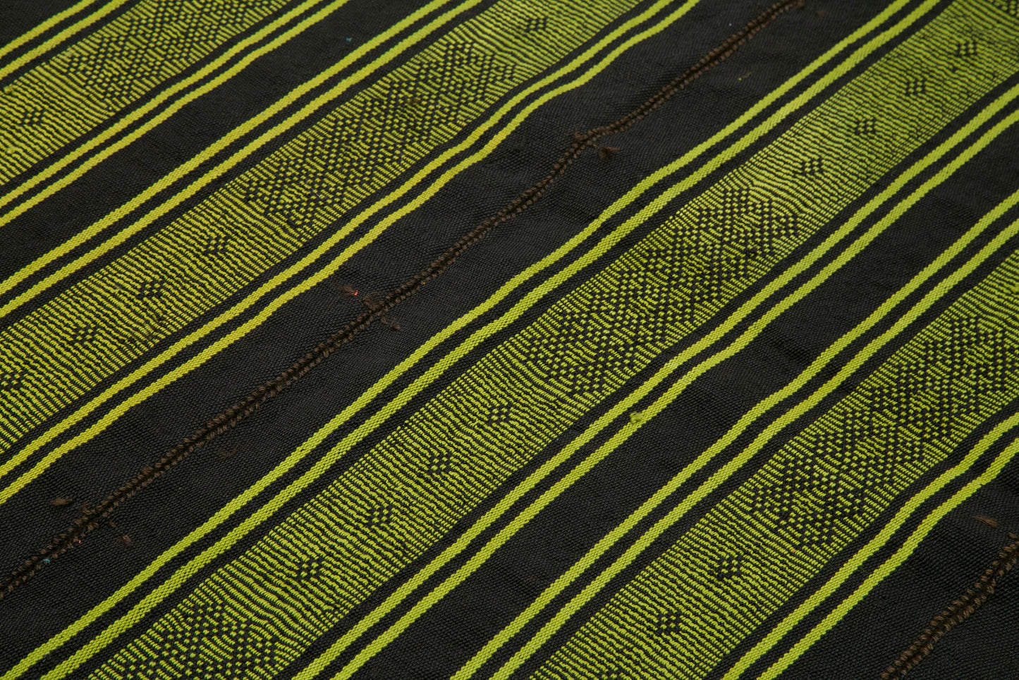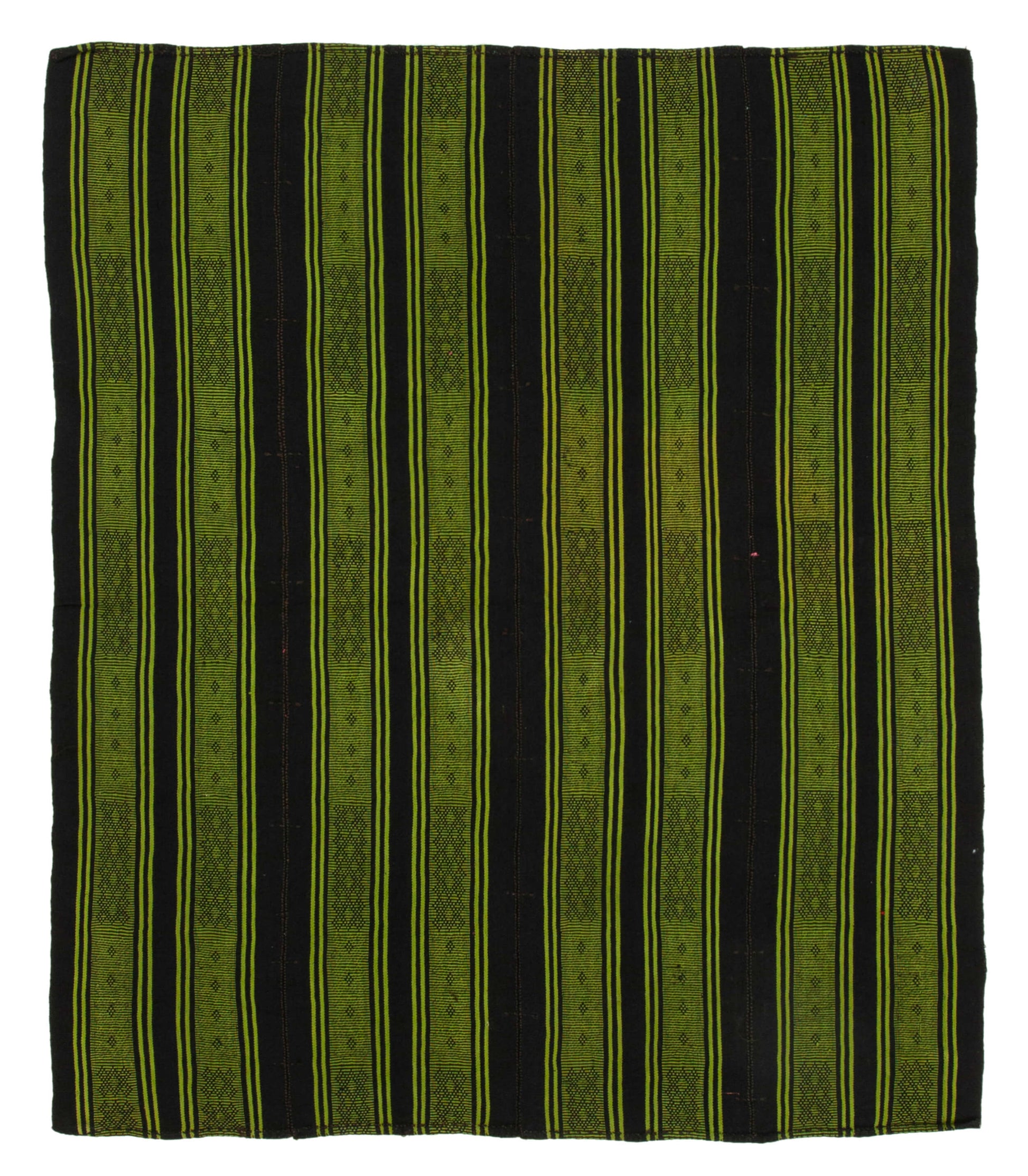 The design of this handwoven rug is a harmonious blend of tradition and style. Featuring a striking pattern of alternating green and black stripes, it creates a bold visual impact. The intricate motifs within the green stripes add depth and character, reflecting the rich cultural heritage of its origin. The use of goat hair in both the weft and warp provides a unique texture and resilience, making it a practical choice for high-traffic areas. The vibrant green hues are not only eye-catching but also versatile, allowing the rug to complement a variety of interior color schemes.