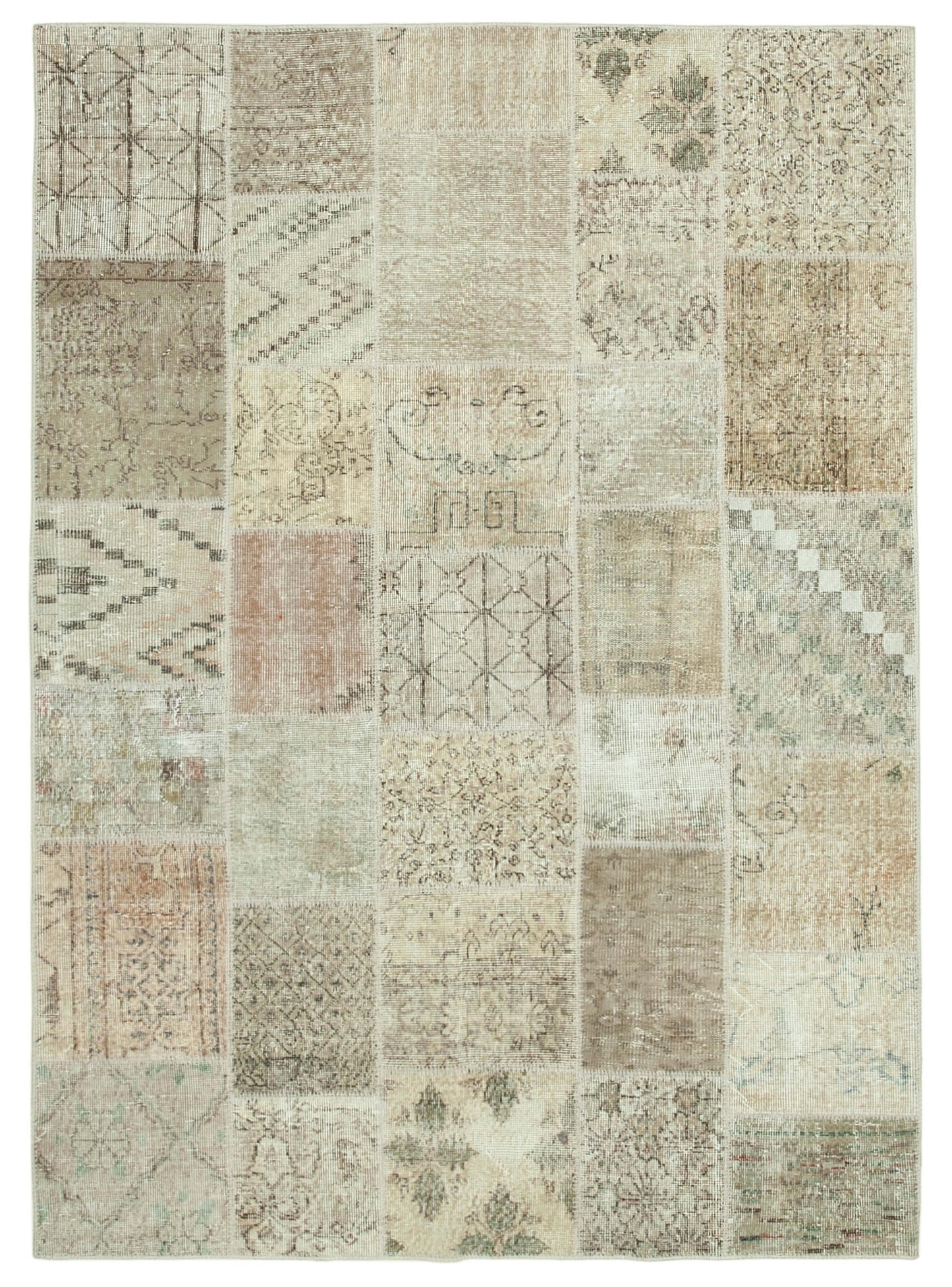 The intricate design of this handwoven rug is a testament to the skilled craftsmanship of its creators. The patchwork pattern features a harmonious blend of geometric and floral motifs, each telling its own story. The subtle variations in beige and other muted tones add depth and character, making it a versatile piece that complements both modern and traditional interiors. The use of high-quality cotton and wool ensures durability and a soft texture, while the vintage age of the rug adds a layer of authenticity and charm.