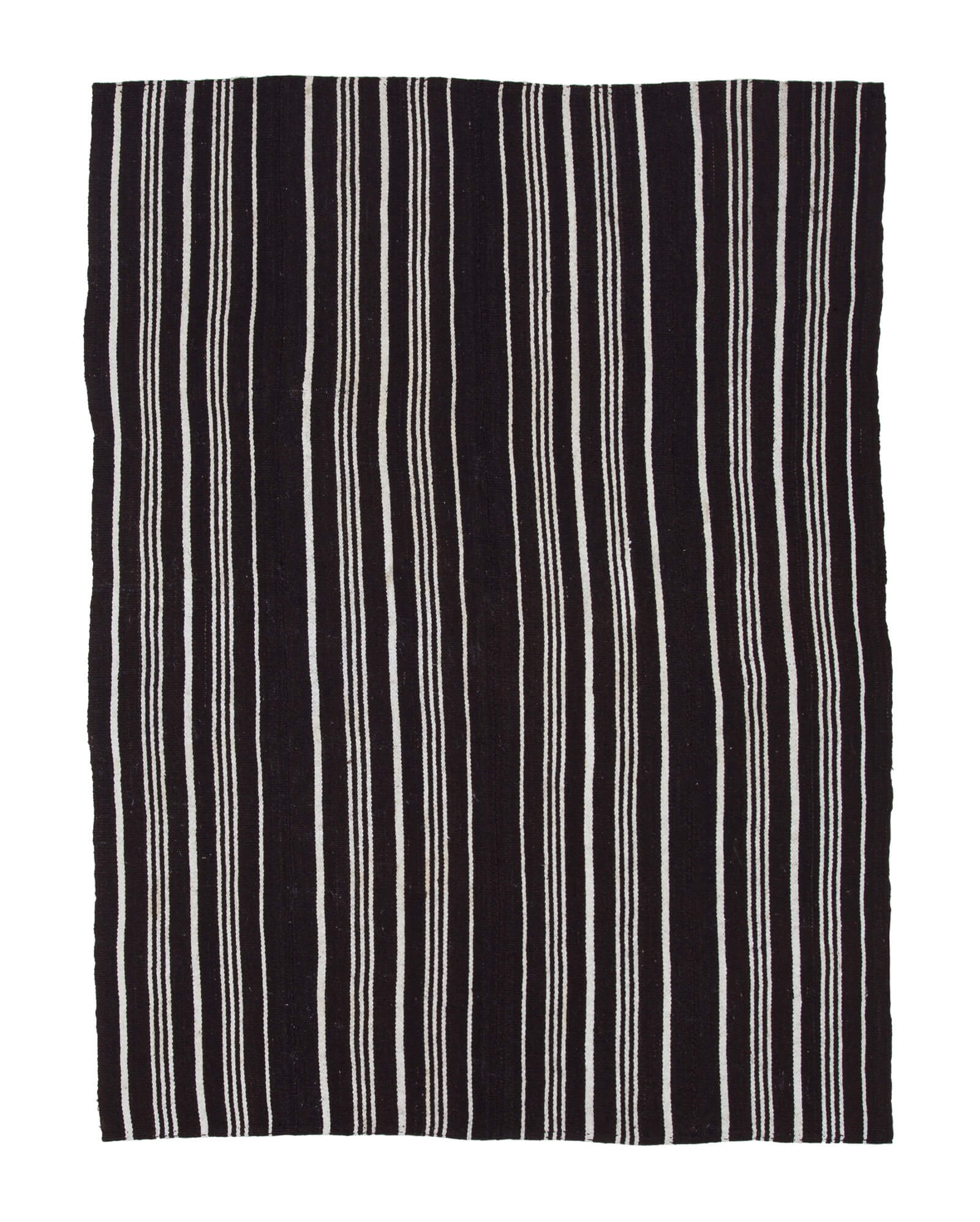 The design of this handwoven rug is a harmonious blend of tradition and style. Featuring a striking black base adorned with elegant white stripes, it creates a bold yet sophisticated visual impact. The use of goat hair in both the weft and warp adds a unique texture and resilience, making it a durable choice for high-traffic areas. The monochromatic color scheme allows it to seamlessly integrate into any decor, while the intricate weaving technique highlights the craftsmanship involved in its creation. This rug is not just a floor covering; it's a piece of art that tells a story of cultural heritage and skilled artistry.