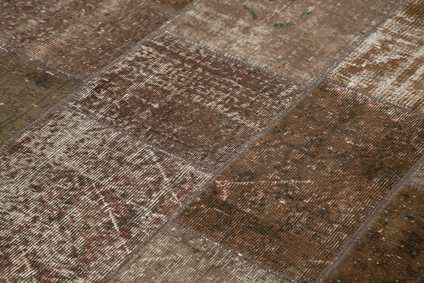 The design of this handwoven rug is a harmonious blend of earthy tones, featuring a palette dominated by rich browns. The intricate patterns and subtle variations in color create a patchwork effect that is both rustic and refined. The rug's thickness, approximately 0.31'' (8.00 mm), provides a plush feel while maintaining a low profile that is easy to maintain. Each section of the rug tells its own story, with unique motifs and textures that reflect the cultural heritage of its origin. This rug is not just a floor covering; it is a work of art that transforms any room into a cozy, inviting haven.