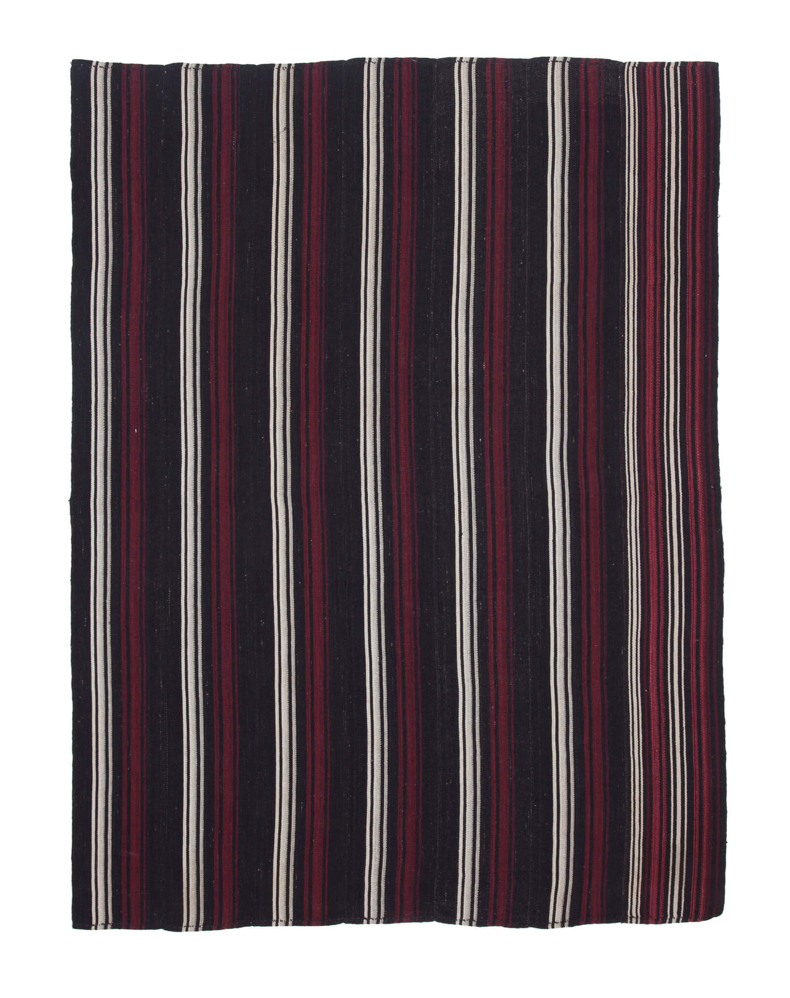 The design of this handwoven rug is a harmonious blend of tradition and style. Featuring a striking pattern of alternating stripes in rich brown, deep red, and classic black, it creates a bold visual impact. The use of goat hair in both the weft and warp ensures durability and a unique texture that adds character to any room. The color palette is versatile, allowing it to complement a variety of interior styles, from rustic to contemporary. Its age and craftsmanship make it not just a rug, but a piece of history that tells a story of cultural heritage.
