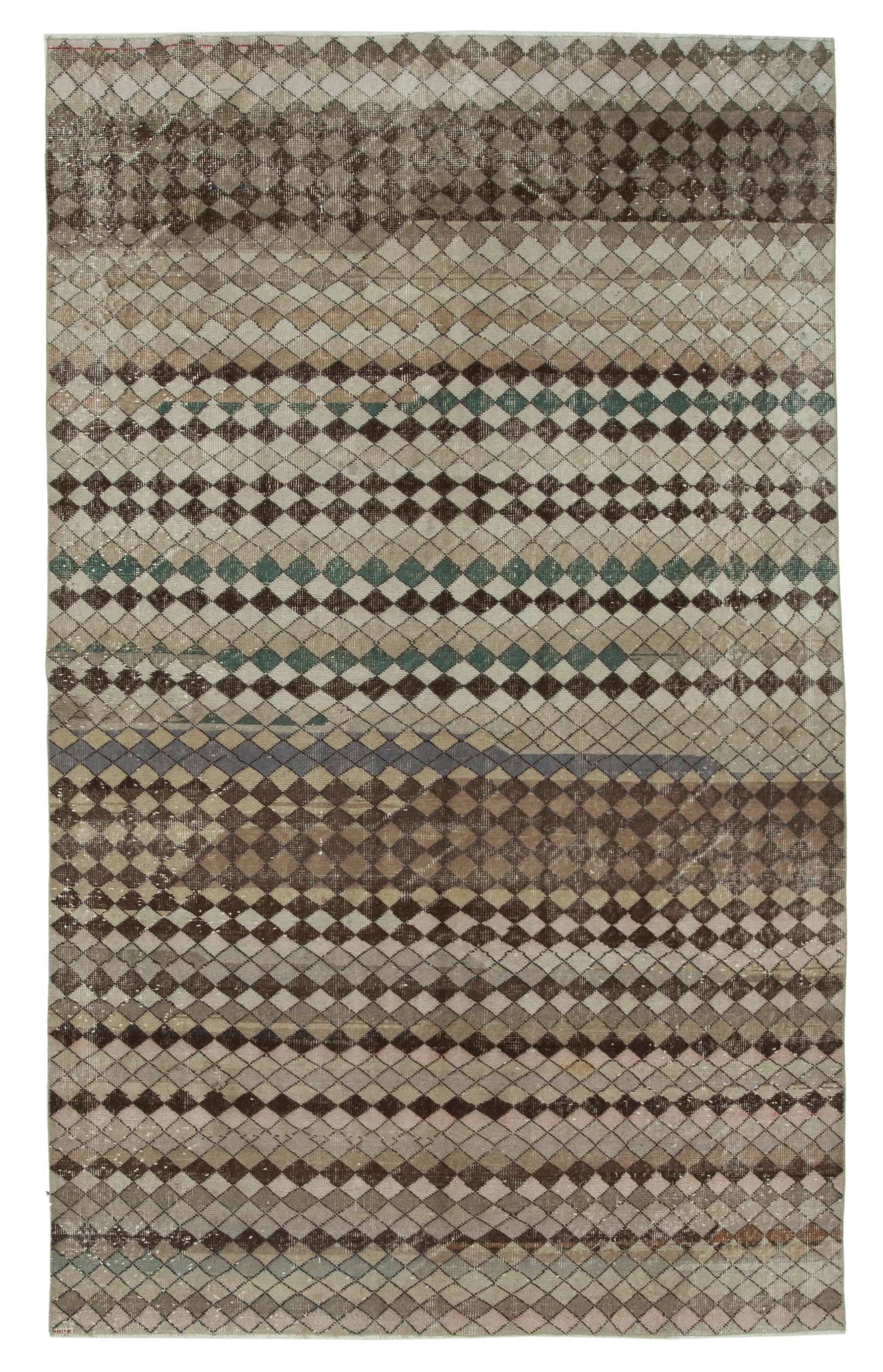 The design of this handwoven rug is a harmonious blend of traditional craftsmanship and contemporary aesthetics. Featuring a captivating geometric pattern, the rug showcases a palette of earthy tones, including beige and various shades of brown and green. These colors are expertly interwoven to create a visually striking yet subtle design that complements a wide range of interior styles. The intricate diamond motifs add depth and texture, making this rug a true work of art. Its cotton and wool composition ensures a resilient structure, while the natural fibers offer a soft, inviting surface.