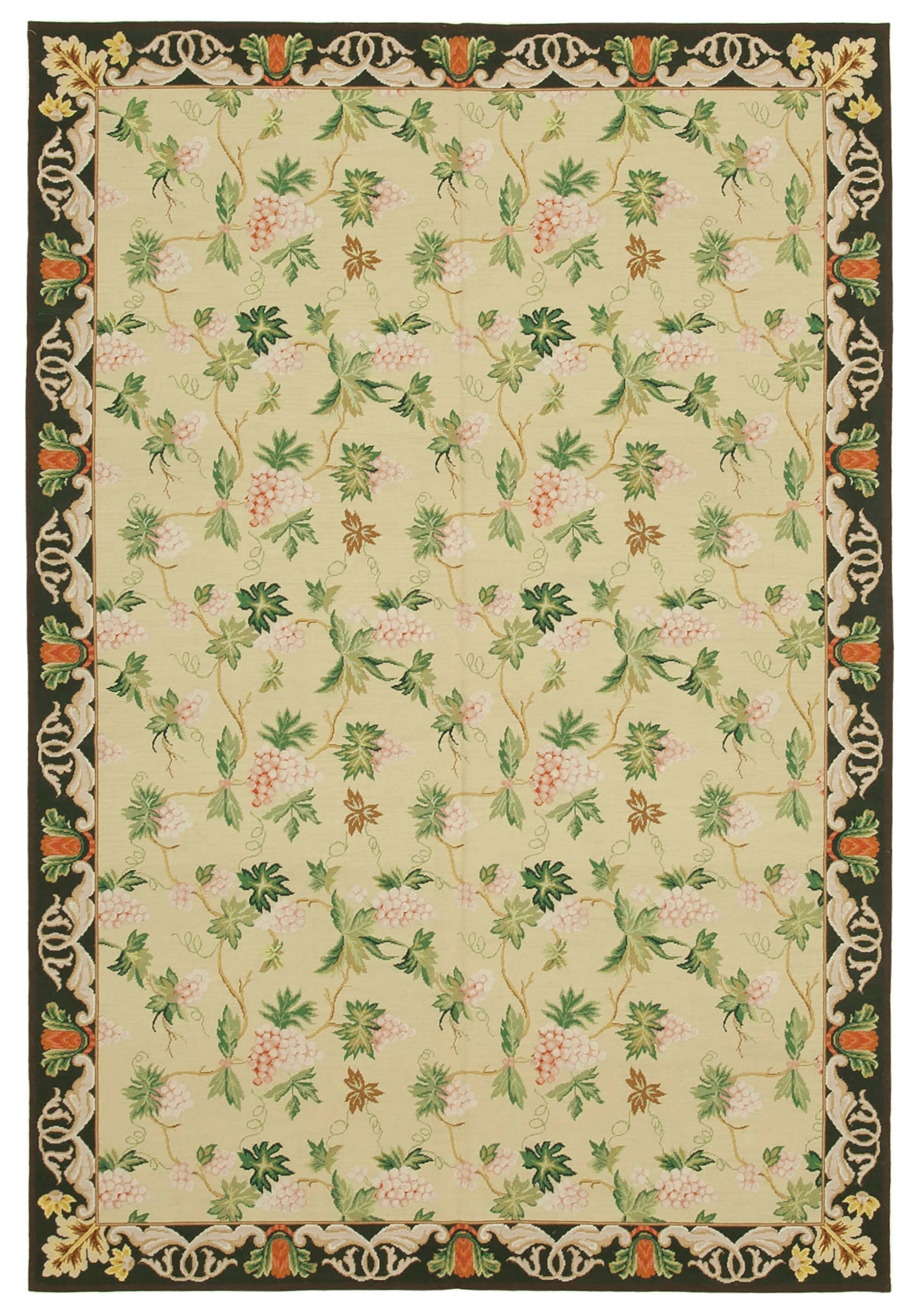 The rug features a captivating design with a beige background adorned with intricate floral and grapevine motifs in soft pinks and greens. The border is a striking contrast, with a dark green frame embellished with ornate patterns in shades of orange, cream, and yellow. This harmonious blend of colors and patterns creates a visually stunning piece that can serve as a focal point in any room. The weft and warp of cotton and wool ensure a sturdy yet soft texture, making it both a practical and luxurious choice for your home.
