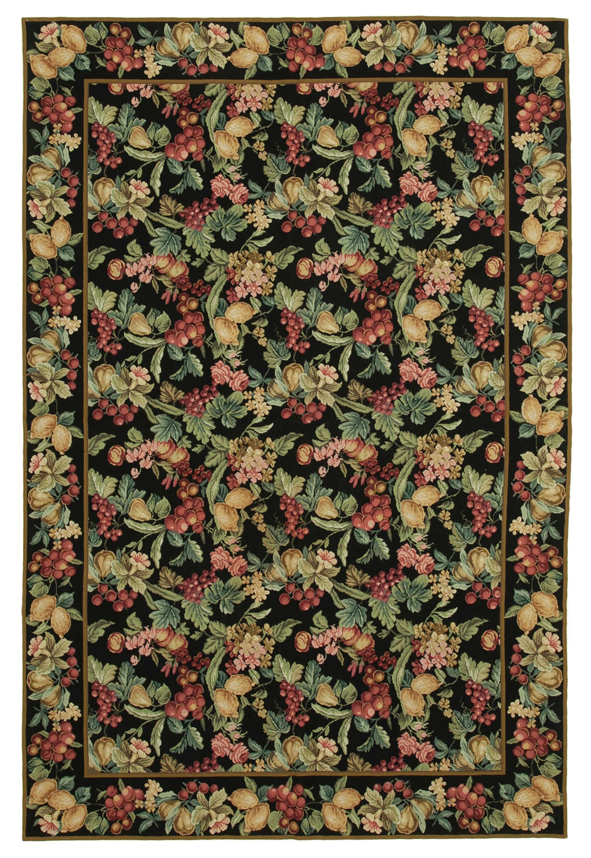 The intricate design of this rug is a celebration of nature's bounty, featuring a vibrant array of colors including black, green, and various shades of red and gold. The lush floral and fruit motifs are meticulously woven, creating a tapestry of visual delight. The black background enhances the vividness of the design, making the colors pop and adding depth to the overall aesthetic. This rug's classic yet bold design makes it a versatile piece that can complement both modern and traditional interiors. Its artistic patterns are not just visually appealing but also tell a story of skilled artisanship and cultural heritage.