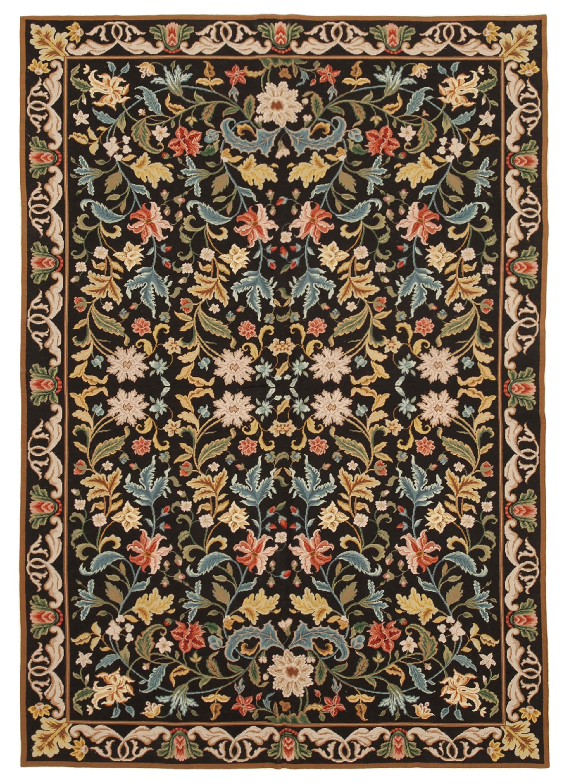 The rug's design is a harmonious blend of black and multicolor tones, creating a vibrant yet elegant aesthetic. The intricate floral patterns are meticulously woven, showcasing a stunning array of colors that include soft blues, warm reds, and gentle yellows. These colors are beautifully set against a deep black background, enhancing the visual appeal and making the design pop. The border features a delicate scroll motif, adding a touch of classic elegance. This rug is not just a floor covering; it's a work of art that brings warmth and style to any space.