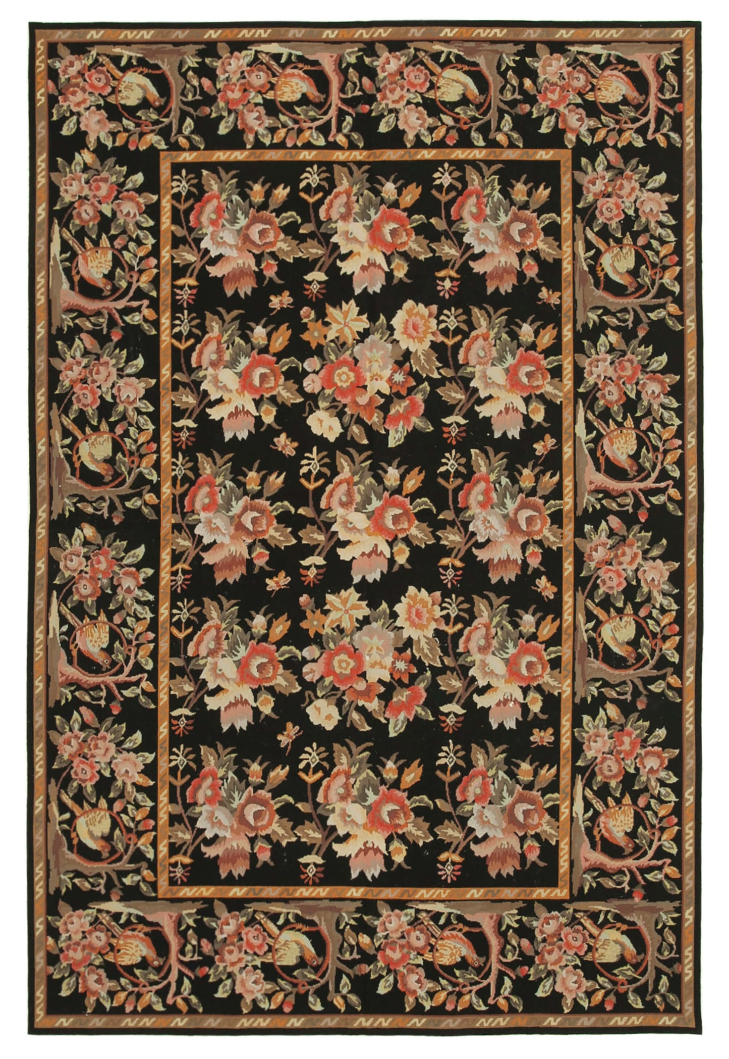 The rug's design is a harmonious blend of traditional motifs and contemporary aesthetics. Set against a deep black background, the vibrant floral patterns in shades of red, orange, and beige create a striking contrast, bringing warmth and vibrancy to your space. The border features intricate floral and bird motifs, adding a layer of complexity and elegance. This handwoven piece showcases the meticulous artistry of skilled craftsmen, making it a unique addition to your decor. The use of high-quality cotton and wool ensures that the colors remain vivid and the texture remains soft for years to come.