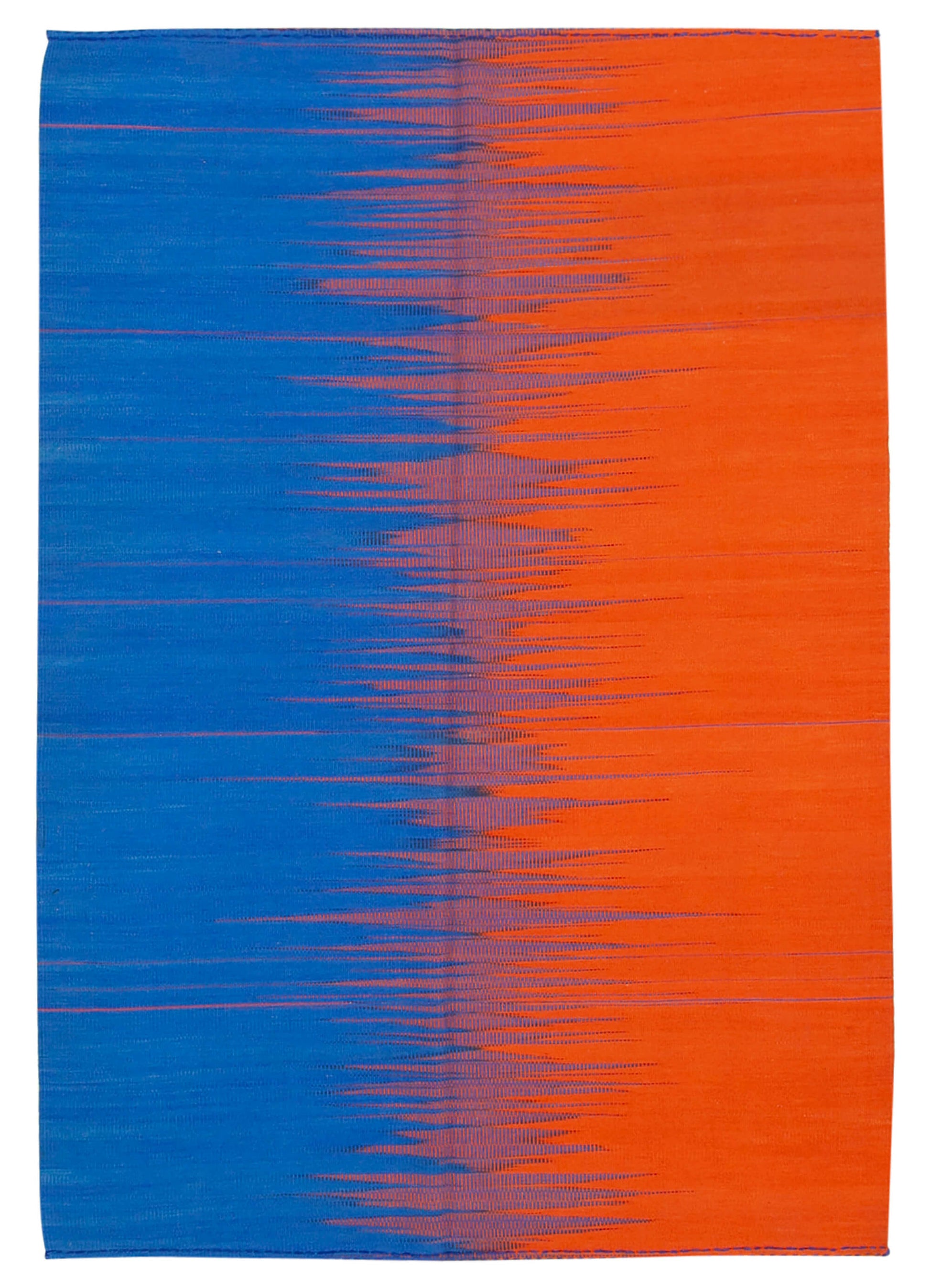 The design of this rug is a vibrant interplay of blue and orange hues, creating a dynamic visual impact. The intricate pattern is a testament to the skill of the artisans, with each thread meticulously woven to form a harmonious blend of colors. The thickness of approximately 0.20'' (5.00 mm) ensures a plush feel, while the cotton and wool weft and warp provide resilience and longevity. This rug's bold color palette and striking design make it a perfect centerpiece for any room, drawing the eye and sparking conversation.
