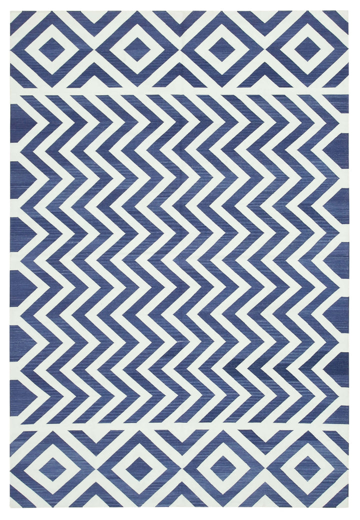 The rug features a striking geometric pattern in a harmonious blend of blue and white hues. The intricate design showcases a series of bold zigzags and diamond shapes, creating a dynamic visual effect that draws the eye. The use of cotton and wool in the weft and warp ensures durability and softness, making it a practical yet luxurious choice. The color palette of blue and white adds a refreshing and calming ambiance, perfect for creating a serene environment in any space.