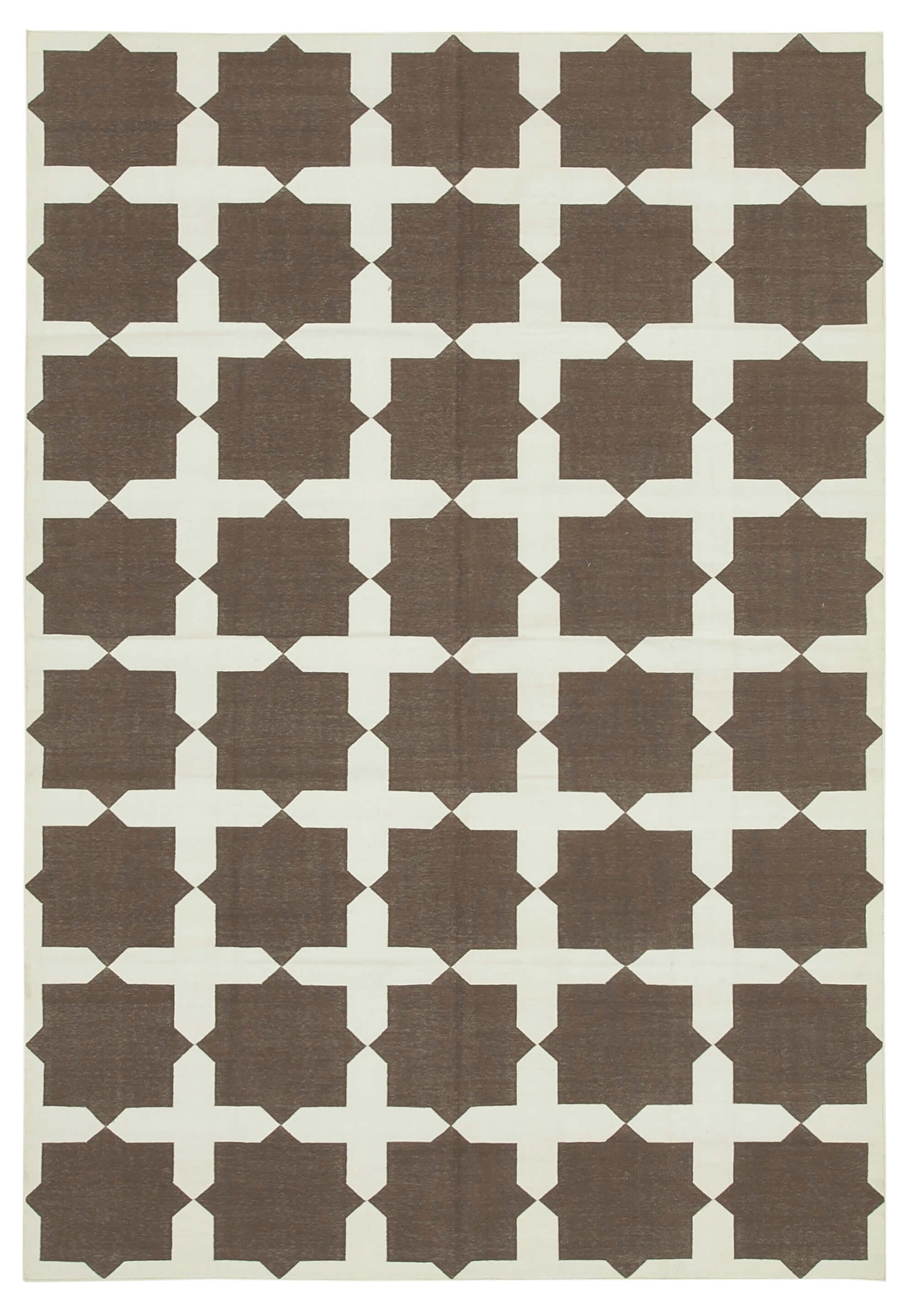 The rug features a striking geometric pattern in a harmonious blend of brown and white tones. The intricate design showcases a series of interlocking shapes, creating a visually captivating effect that draws the eye. The use of cotton and wool in the weft and warp ensures durability and softness, making it ideal for high-traffic areas. The neutral color palette allows it to seamlessly integrate into various decor styles, from contemporary to classic. Its substantial size makes it a focal point, perfect for anchoring a seating area or defining a dining space.