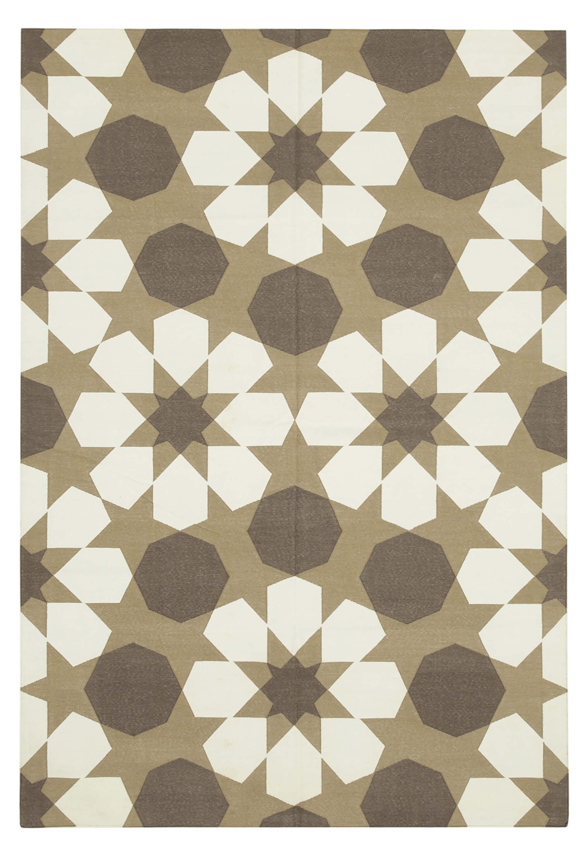 The design of this rug is a harmonious blend of geometric patterns in soothing shades of brown and white. The intricate motifs create a captivating visual effect, drawing the eye and adding a sophisticated touch to your space. The use of cotton and wool in the weft and warp provides a soft yet resilient texture, ensuring the rug maintains its beauty over time. The neutral color palette allows for versatile styling, seamlessly integrating with various decor themes, from contemporary to traditional.