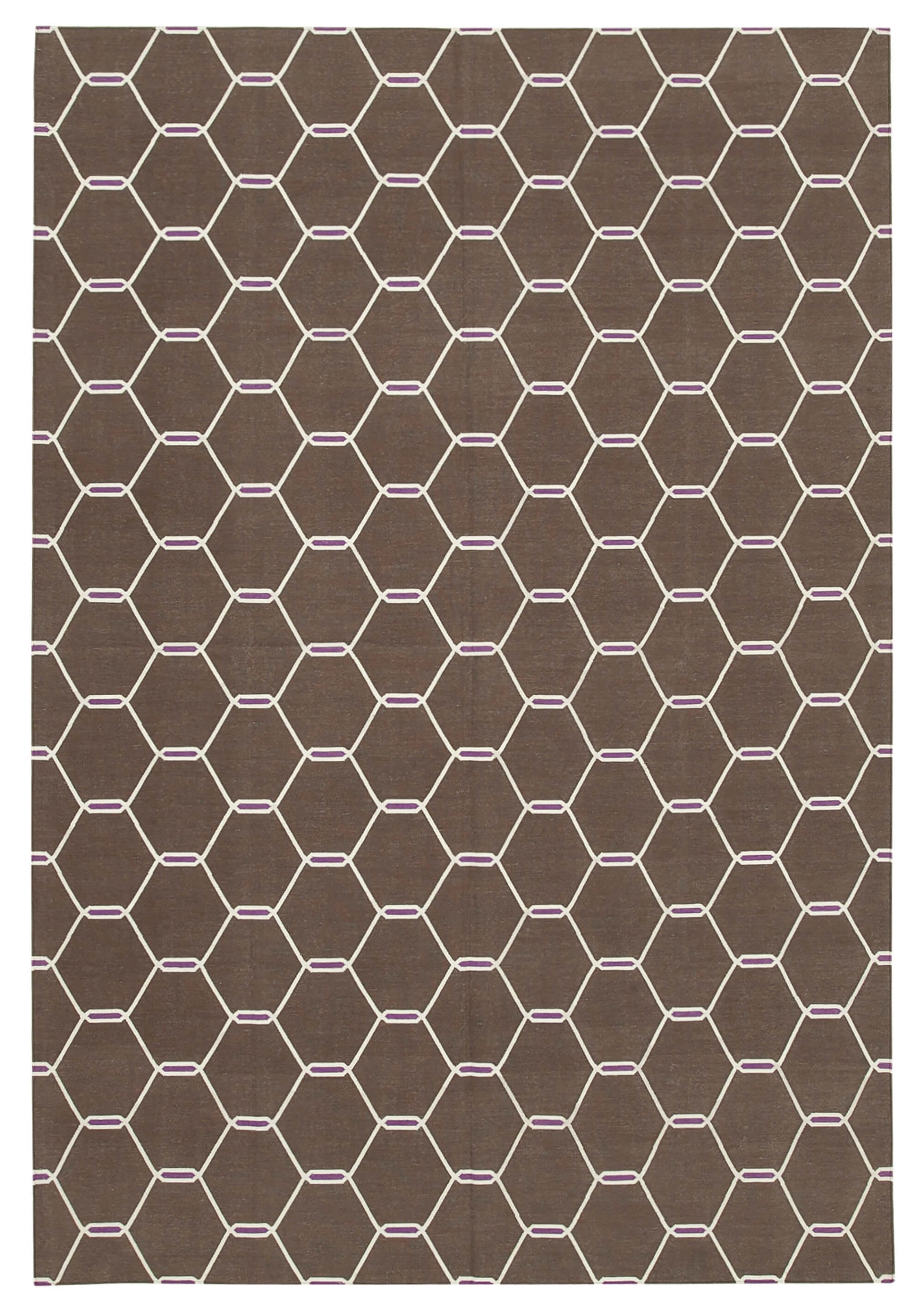 The design of this handwoven rug is a testament to the skill and artistry of its creators. Featuring a captivating geometric pattern, the rug showcases a series of interconnected hexagons, each outlined in a subtle contrast that enhances its visual appeal. The intricate weft and warp of cotton and wool ensure durability and resilience, making it suitable for high-traffic areas. The harmonious blend of colors and textures creates a dynamic yet balanced look, perfect for adding depth and character to your space. Its unique design makes it a standout piece that complements both contemporary and traditional interiors.
