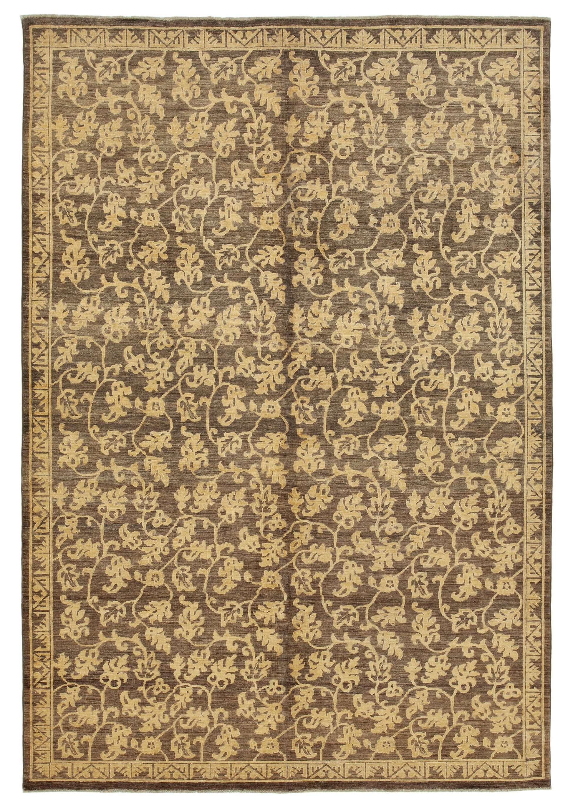 The intricate design of this rug is a testament to the skill and artistry of its weavers. The weft and warp are meticulously crafted from cotton and wool, ensuring durability and a soft texture. The rug features a captivating pattern of floral motifs in shades of yellow against a rich brown background, evoking a sense of nature and tranquility. The border is adorned with a geometric design that frames the central pattern beautifully, adding a touch of sophistication. This rug's color palette and design make it a perfect fit for both contemporary and traditional settings, seamlessly blending with various interior styles.