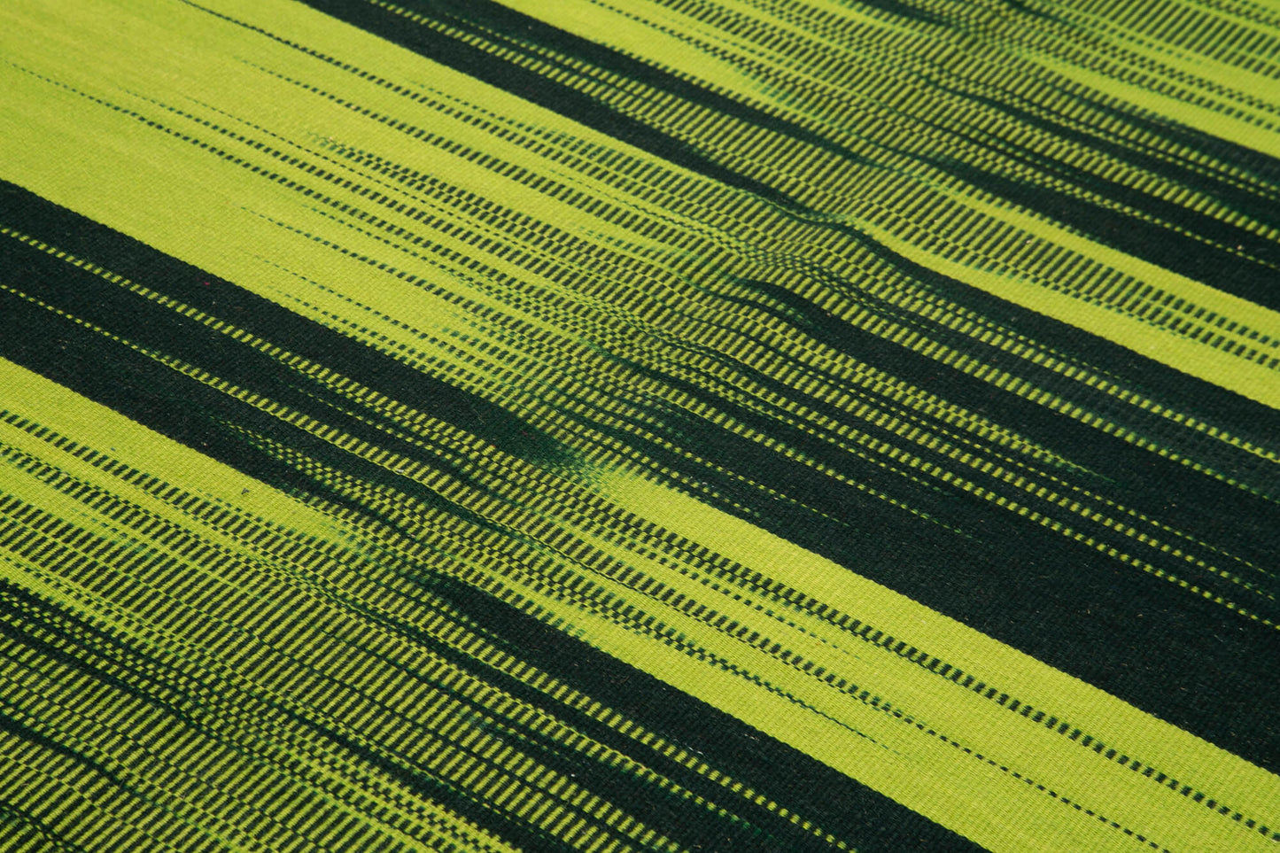 The rug features a striking pattern of alternating green and black stripes, creating a bold visual impact. The intricate weaving technique highlights the skillful interplay of colors, with the green hues providing a refreshing contrast to the deep black tones. The use of cotton and wool in the weft and warp ensures a soft texture, while the robust construction promises longevity. This rug is not just a floor covering; it's a statement piece that reflects a blend of tradition and modernity, making it a versatile choice for various interior styles.