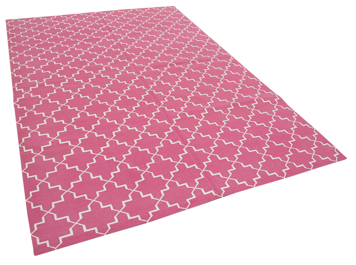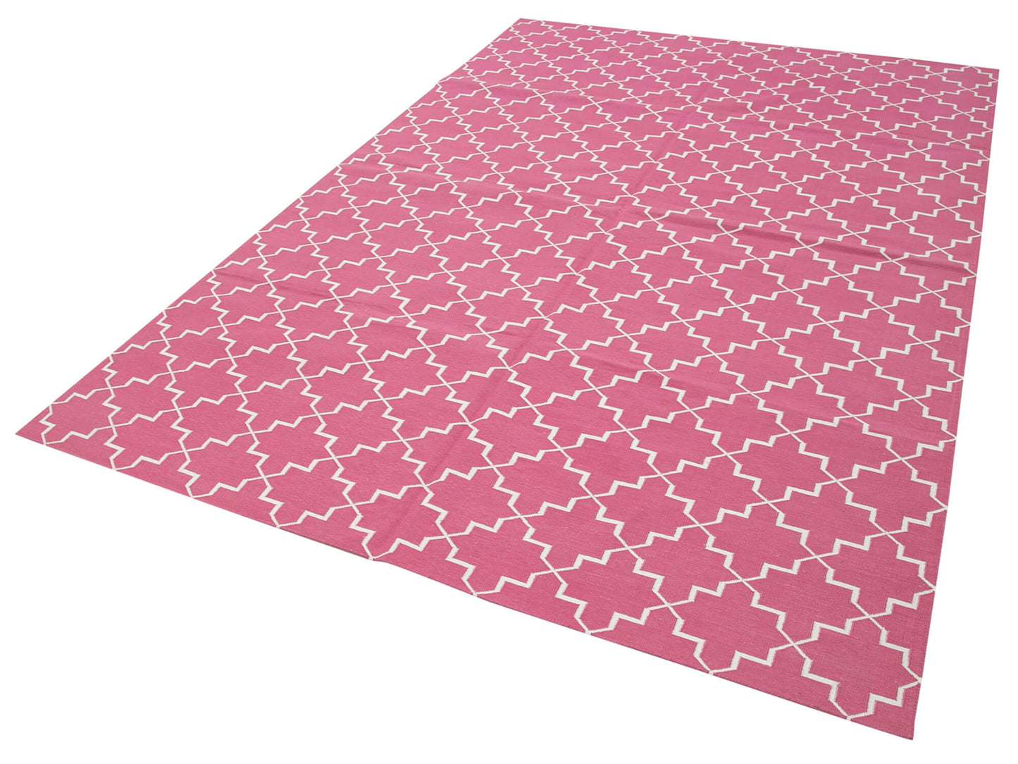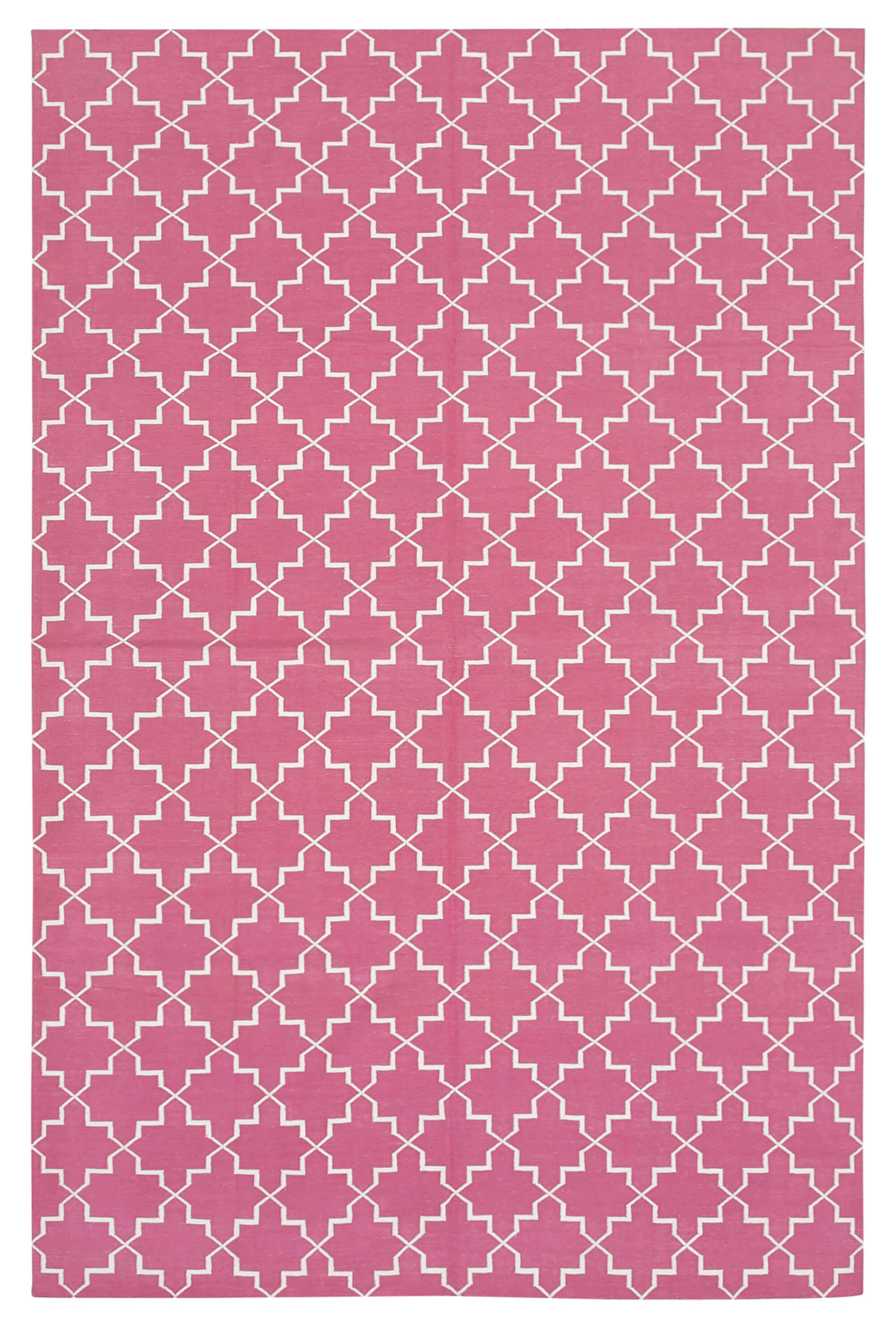 The rug features a captivating geometric pattern in a harmonious blend of pink and white hues. The intricate design is a testament to the skill and dedication of the artisans who crafted it. The cotton and wool weft and warp ensure durability and resilience, making it suitable for high-traffic areas. The vibrant pink color adds a pop of color, while the white accents create a balanced and elegant look. This rug is not just a floor covering; it's a statement piece that enhances the aesthetic of any space.