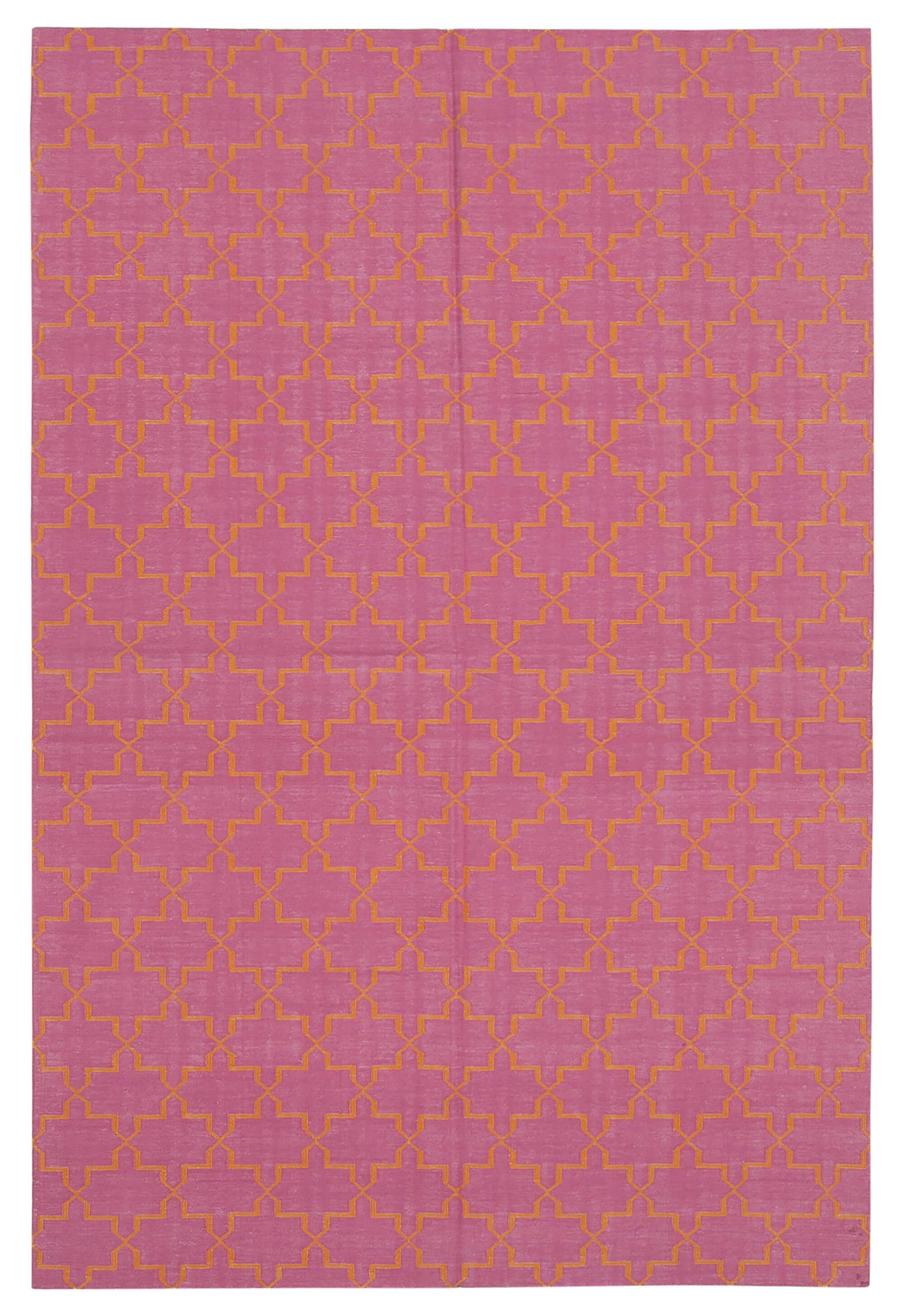 The rug features a captivating geometric pattern in a vibrant pink hue, accented with subtle yellow lines that create a harmonious and eye-catching design. This color combination adds a lively yet sophisticated touch to any decor. The intricate weft and warp of cotton and wool not only enhance its durability but also contribute to its luxurious feel. The rug's design is versatile, making it suitable for both modern and traditional interiors. Its timeless appeal ensures it will remain a cherished piece in your home for years to come.